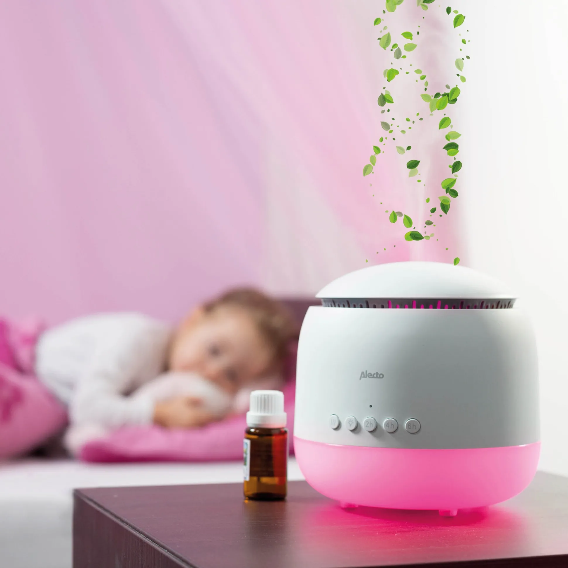 Deze 3 in 1 luchtbevochtiger van Alecto zorgt voor een gezonde luchtvochtigheid in de kinderkamer. De luchtbevochtiger is geschikt voor aromatherapie / etherische oliën en werkt het beste in een ruimte tot 25m2.De luchtbevochtiger heeft een nachtverlichting in meerdere kleuren, een waterreservoir van 300ml, een timerfunctie (2-4-6 uur). Daarnaast is de bevochtiger geluidsloos en schakelt hij automatisch uit bij een leeg waterreservoir.