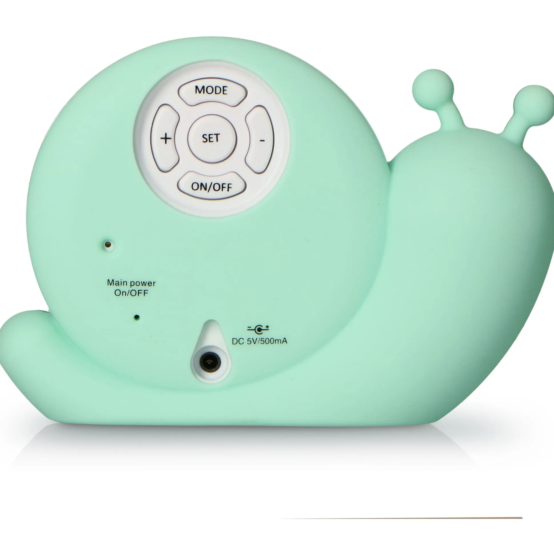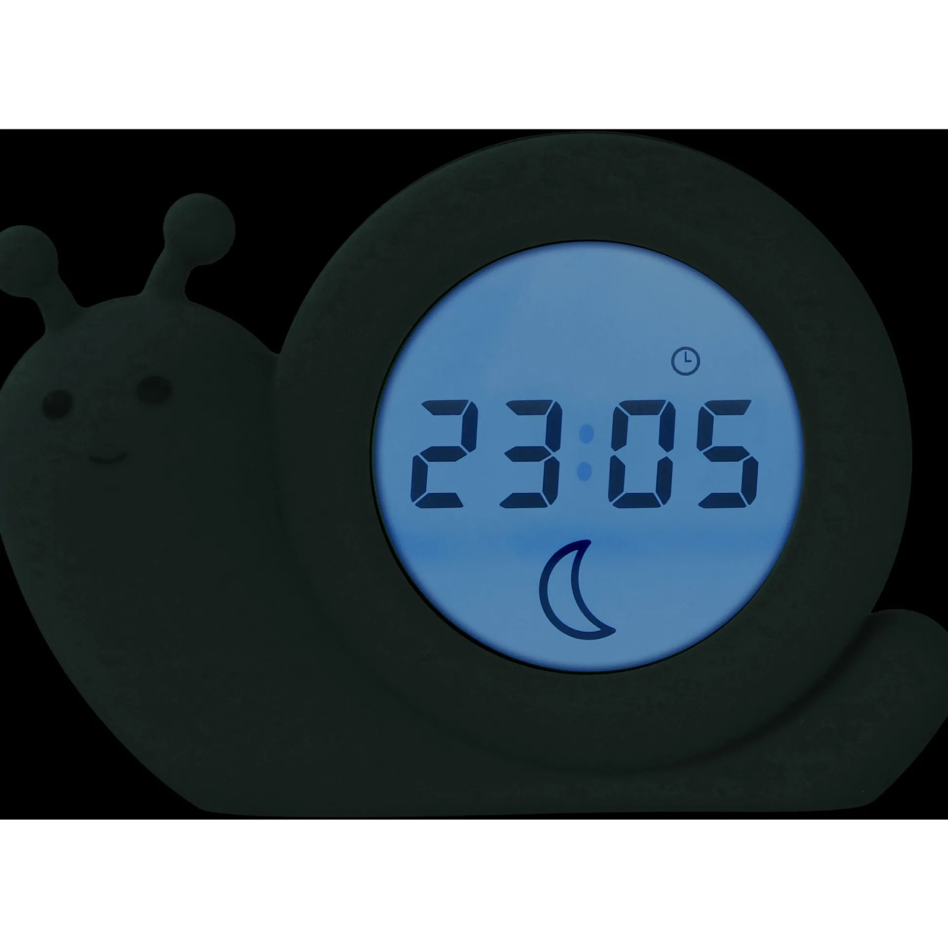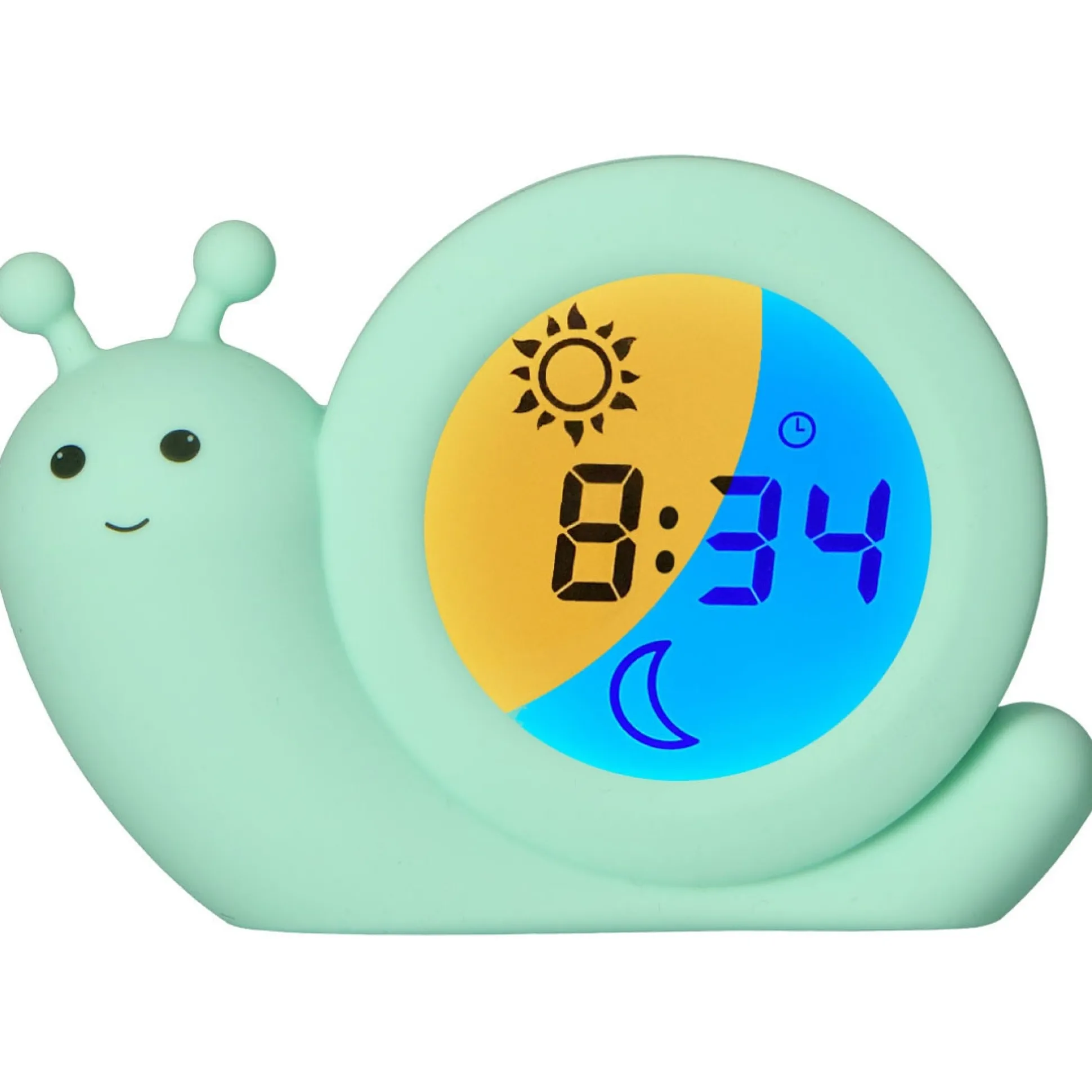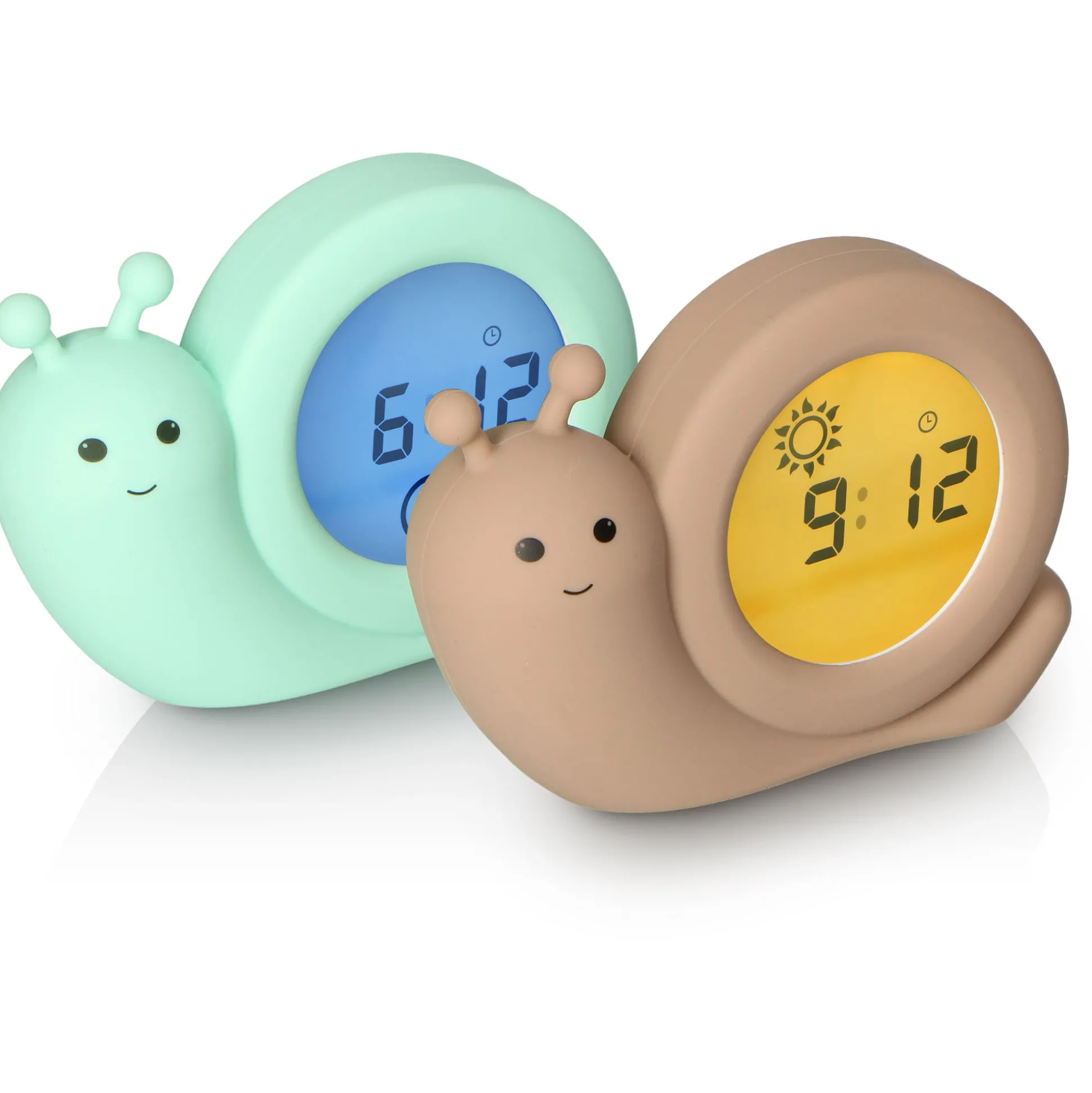 De BC110GN SIMON van Alecto Baby is een 3-in-1 slaaptrainer, wekker én nachtlampje. En dat in de vorm van een vriendelijk slakje, Simon genaamd. Deze slaaptrainer helpt kleinere kindjes met het krijgen van tijdsbesef. Als ouder stel je in wanneer het tijd is om op te staan. Het display is ’s nachts blauw en toont een maantje. Hét teken om in bed te blijven. Is het tijd om op te staan? Het display van de BC110GN SIMON wordt oranje en laat een zonnetje zien. De BC110GN SIMON wordt geleverd met een extra lange oplaadkabel (200 cm), maar is ook oplaadbaar en daardoor ook mee te nemen en draadloos te gebruiken.