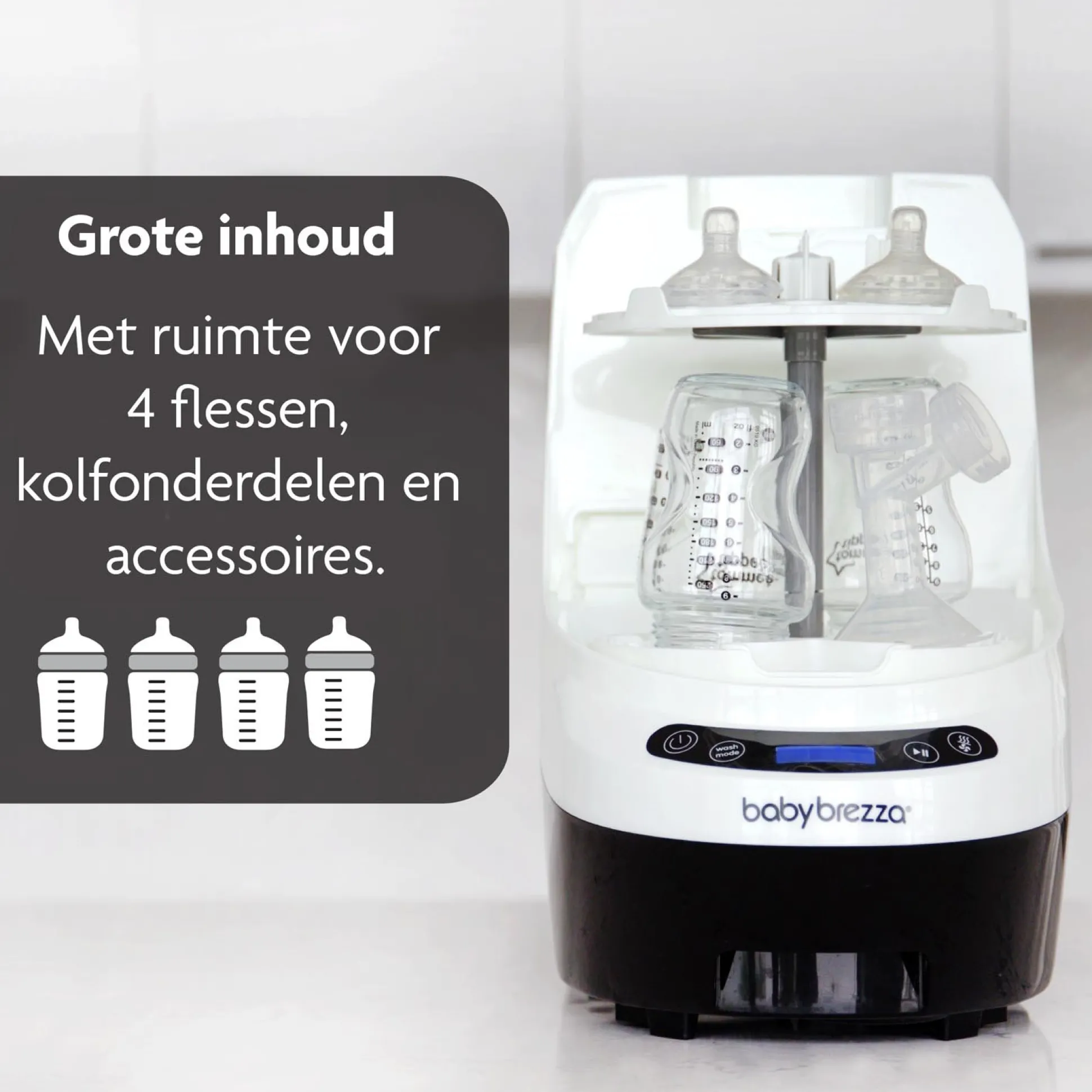 De Baby Brezza Bottle Washer Pro is dé alles-in-één oplossing voor het schoonmaken van babyflesjes. Deze slimme flessenwasser spoelt, wast, steriliseert én droogt automatisch met één druk op de knop. Geen gedoe meer met de hand afwassen of aparte sterilisatie! In slechts 10 minuten zijn de flesjes hygiënisch schoon, vrij van bacteriën én droog. De Bottle Washer Pro biedt ruimte voor 4 flessen en accessoires zoals spenen en flesringen. Dankzij het compacte design past hij perfect in elke keuken. Zo bespaar je tijd en heb je altijd schone flesjes binnen handbereik.