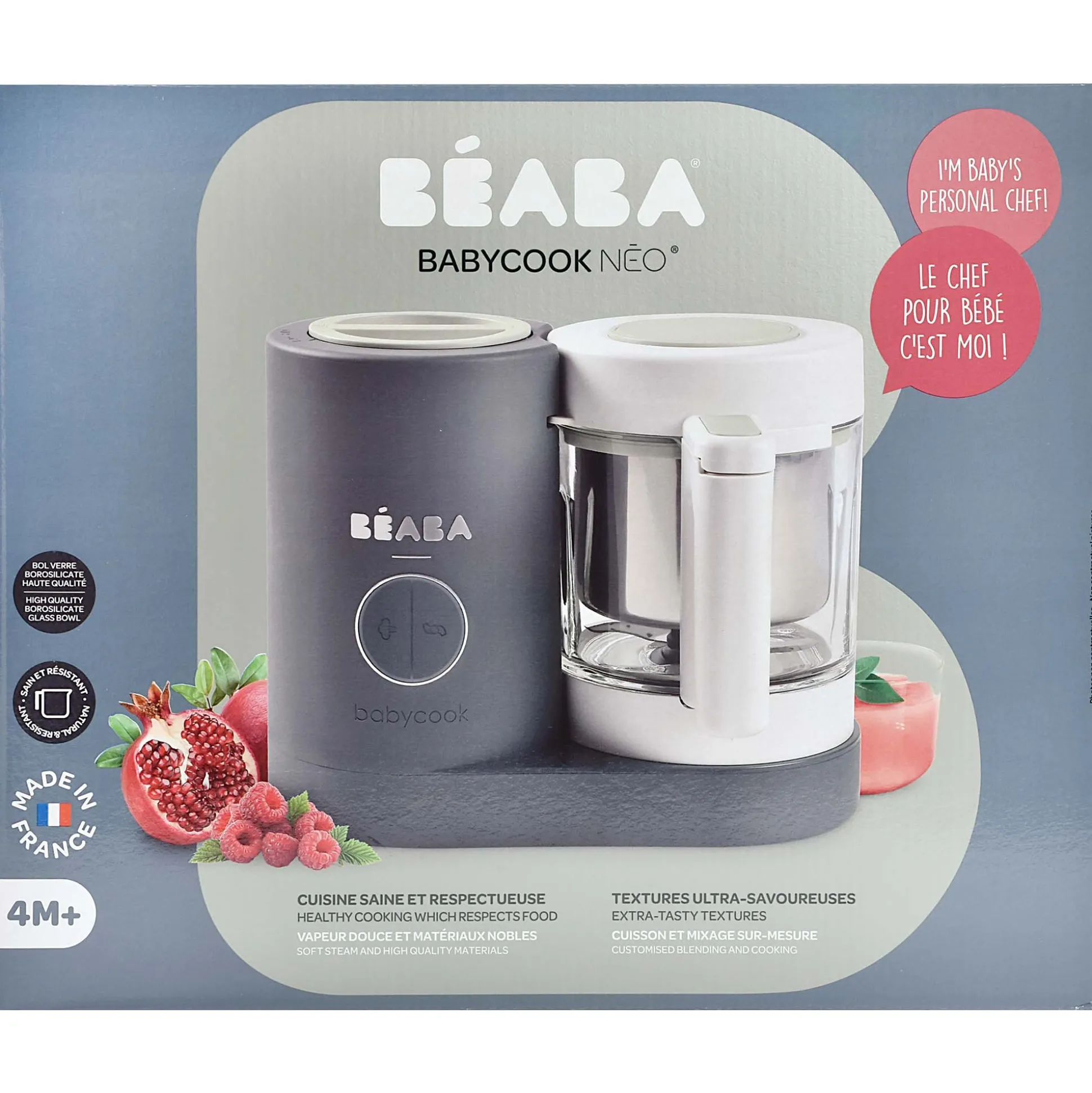 De BÉABA Babycook Néo zorgt voor het zacht stomen en de modulatie van het koken: om de voedingwaarde, de smaak en het aroma van voedsel te behouden en het waterverbruik te beperken. Gemaakt van duurzame materialen: glazen kom, roestvrijstalen mand en kom voor gezond en respectvol koken. 4-in-1 keukenmachine: stomen, mixen, ontdooien en opwarmen. Grote inhoud: glazen kom van 1250ml en roestvrijstalen mandje met een capaciteit van 1000ml voor het bereiden van 4 porties van 150gr. Gebruiksvriendelijk: duidelijke markering van de waterniveaus. Geluids- en lichtsignalen wanneer het koken klaar is. Krachtig mes: roestvrijstalen mes van hoge kwaliteit met 2 niveaus, gepatenteerd product, vervaardigd door Sabatier Diamant, voor homogeen en op maat gemaakt mengen naargelang de leeftijd van jouw kindje: glad, gemalen of gehakt voedsel. Gemaakt in Frankrijk.