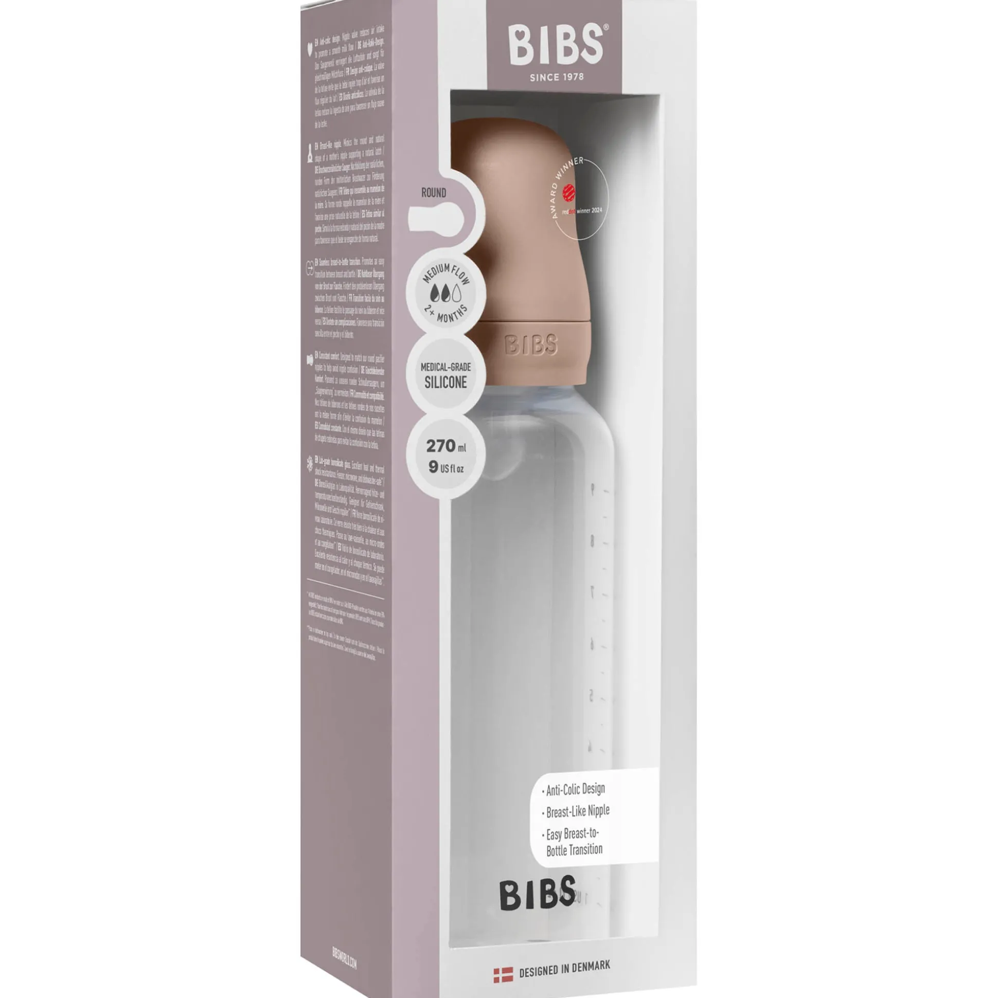 Maak kennis met de bekroonde babyfles van BIBS, geliefd om zijn stijlvolle uiterlijk, het anti-colic ventiel dat gasvorming en reflux vermindert, en de speen die de overgang tussen borstvoeding en flesvoeding vergemakkelijkt. De fles heeft een duurzame, vaatwasmachinebestendige, lichte basis die gemakkelijk door kleine handjes vast te pakken is, en onderdelen die lekken minimaliseren, ideaal voor voedingen thuis of onderweg. De ultra-zachte, hypoallergene medische siliconen speen is gemakkelijk te steriliseren, versterkt met ribbels voor extra duurzaamheid en heeft een antislipstructuur voor een veilige grip. Wordt geleverd met een speen met medium doorstroming. BPA-vrij en geschikt vanaf 0+ jaar. Inclusief een melk-stop tegen lekken on the go, opvouwbare trechter voor makkelijk vullen met melkpoeder en maatverdeling in standaard voedingshoeveelheden.