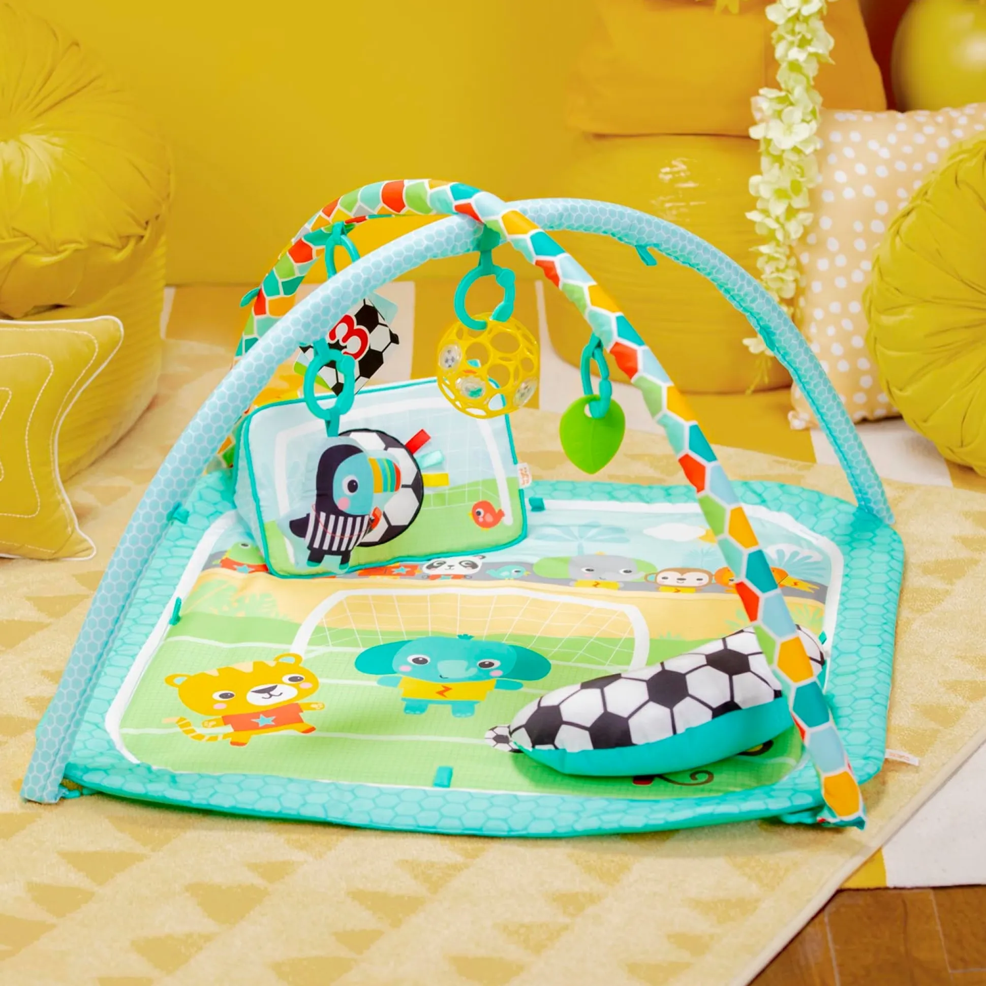 Klaar, trap, GOAL! We brengen onze favoriet, de Oball, naar het voetbalveld met de Bright Starts Grip & Kick Oball activiteitengym. Deze speelgym met 4 manieren om te spelen geeft je voetballertje een kick. De speelgoedbogen en ontwikkelingsactiviteiten zijn gemakkelijk te verplaatsen voor speelplezier op de buik, liggen & spelen, zitten & spelen of om mee te nemen. De mat is voorzien van een uiterst responsief trappelkussen met lichtjes, melodietjes en juichende geluiden die het getrappel of geklop van je baby belonen! Met meer dan 30 melodieën en geluiden is spelen altijd leuk en afwisselend. Met 4 extra speeltjes: flashcards met nummers en dieren, een toekan-knuffel met belletjes, bladspeeltje met textuur en de vertrouwde, makkelijk vast te pakken Oball. Stimuleer de motorische vaardigheden van je kindje en moedig de eerste trapjes aan!