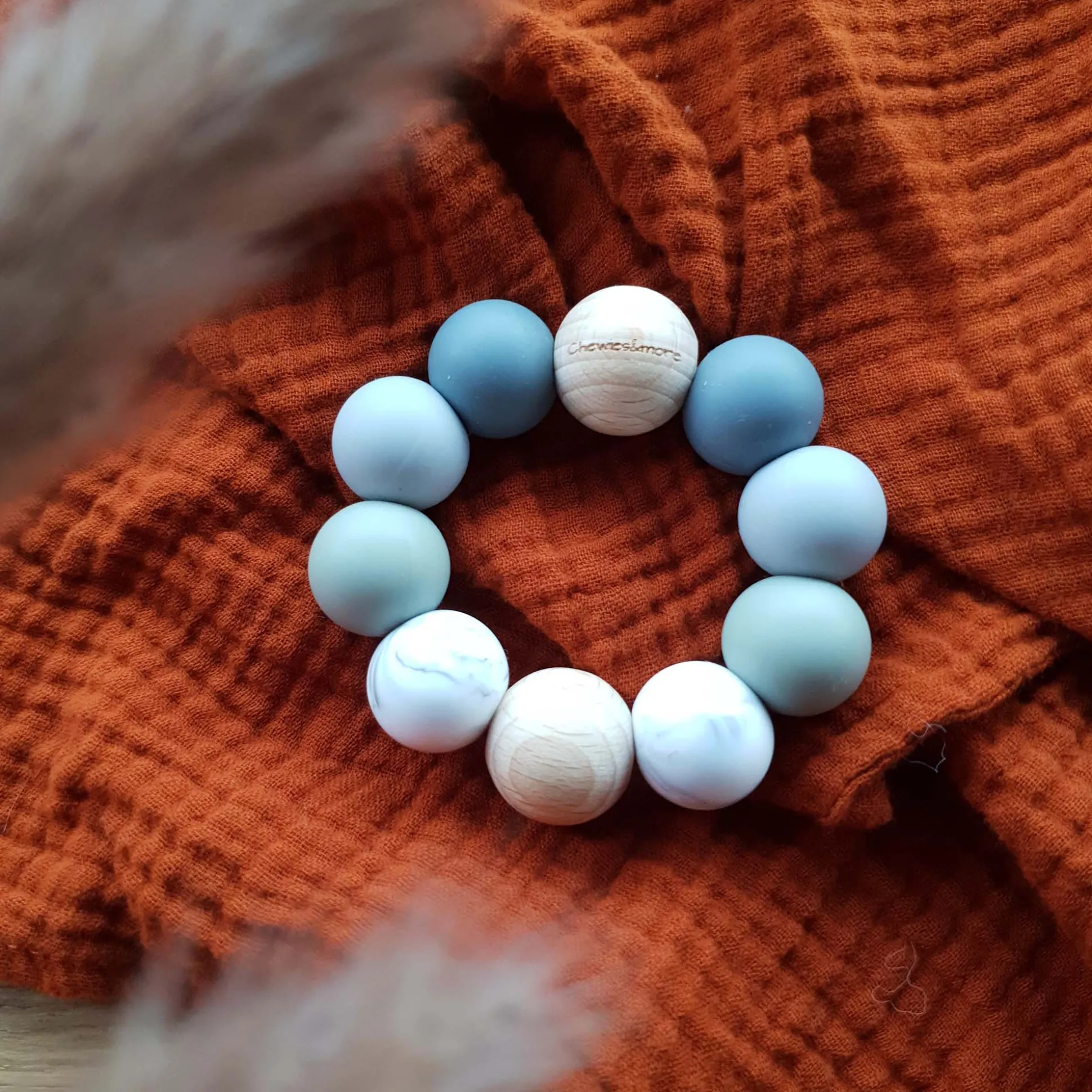 De basic chewie van Chewies&more zijn makkelijk vast te houden door jouw kleintje dankzij het ronde formaat. De contrasten en de verschillende kleuren maken het interessant voor je kindje. De chewie masseert het gevoelige tandvlees en verzacht de pijn bij doorkomende tandjes. De kralen zijn gemaakt van 100% siliconen en organisch beukenhout. Het beukenhout heeft een uitstekende antibacteriele werking en doordat de siliconen kralen volledig recyclebaar zijn heeft het een lange levensduur. Het formaat is ongeveer 7,5 cm. De chewie is in verschillende kleuren verkrijgbaar. De siliconen kralen kunnen met water en mild sopje worden afgenomen. De houten kralen kan je afnemen met een vochtige doek en aan de lucht laten drogen. Je kan de chewie niet uitkoken, in de sterilisator of vaatwasser plaatsen.