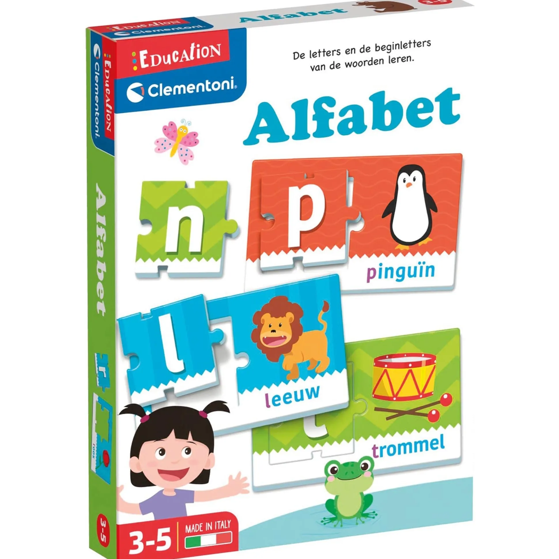 Spelenderwijs leren met Clementoni Education. Laat je kleintje met de Clementoni Education alfabet op een leuke en leerzame manier kennismaken met letters, klanken en hun eerste woordjes. Dit vrolijke educatieve spel van Clementoni Education is speciaal ontworpen voor kinderen van 3 tot 5 jaar en maakt leren een feest. De set bestaat uit: 26 speelkaarten met kleurrijke afbeeldingen en woorden, 26 puzzelstukken met letters en een complete alfabetpuzzel Of je kindje nu graag alleen speelt of liever samen met vriendjes en vriendinnetjes — dit spel past zich moeiteloos aan. Het helpt bij het ontwikkelen van taalgevoel, concentratie en zelfstandigheid, terwijl het spelplezier voorop blijft staan. Geschikt voor kinderen van 3 tot 5 jaar.