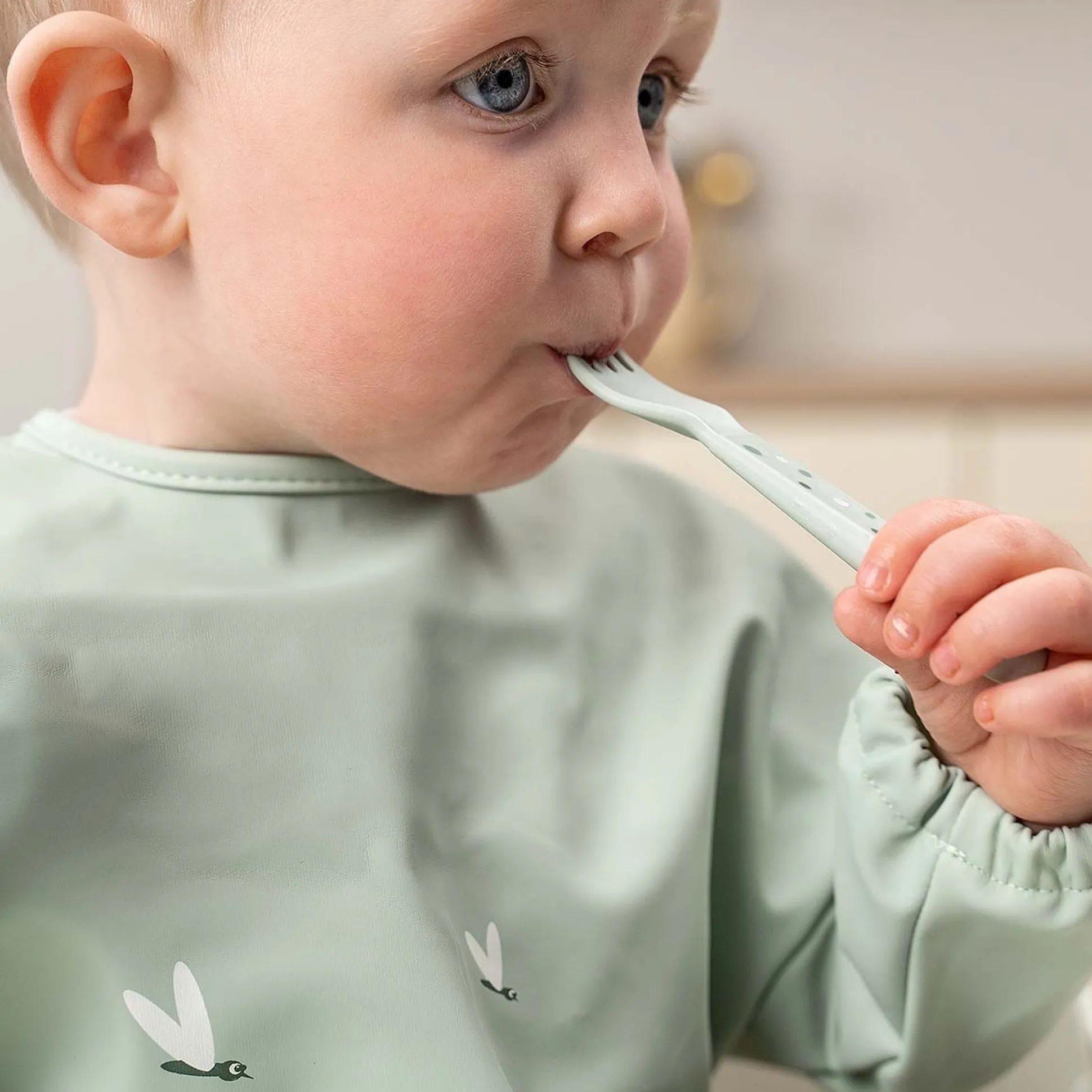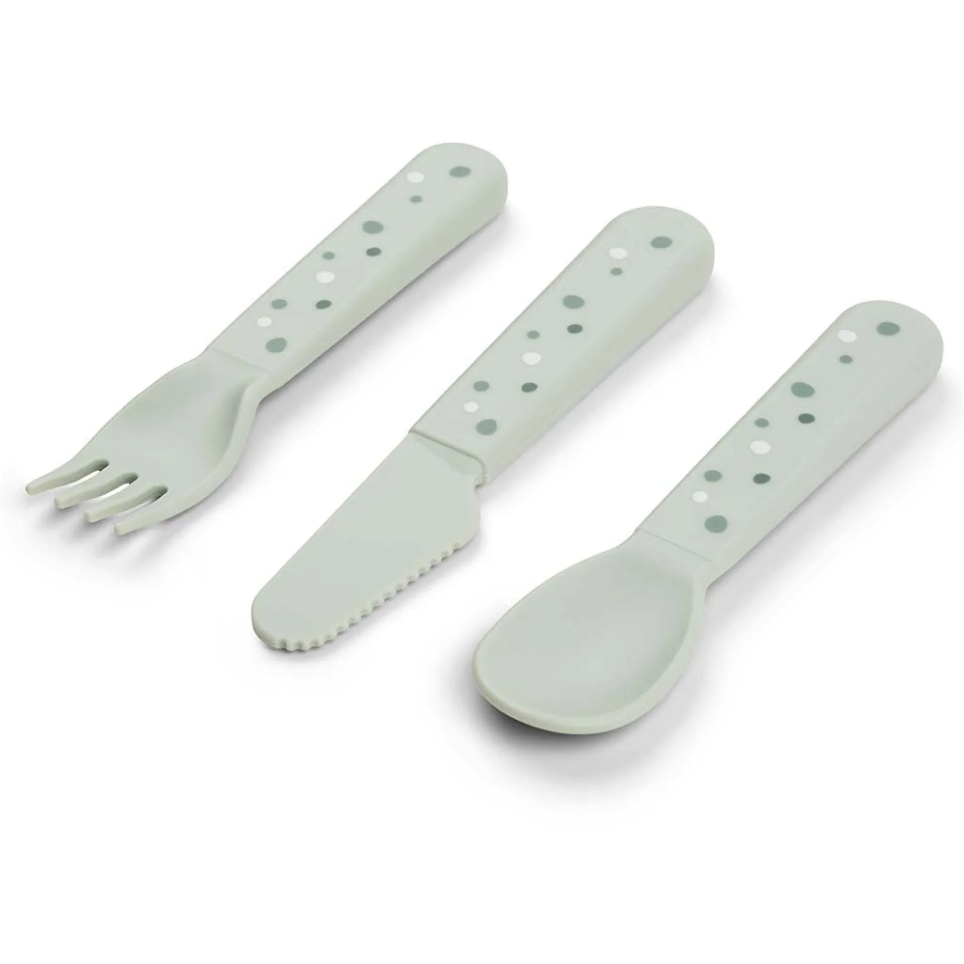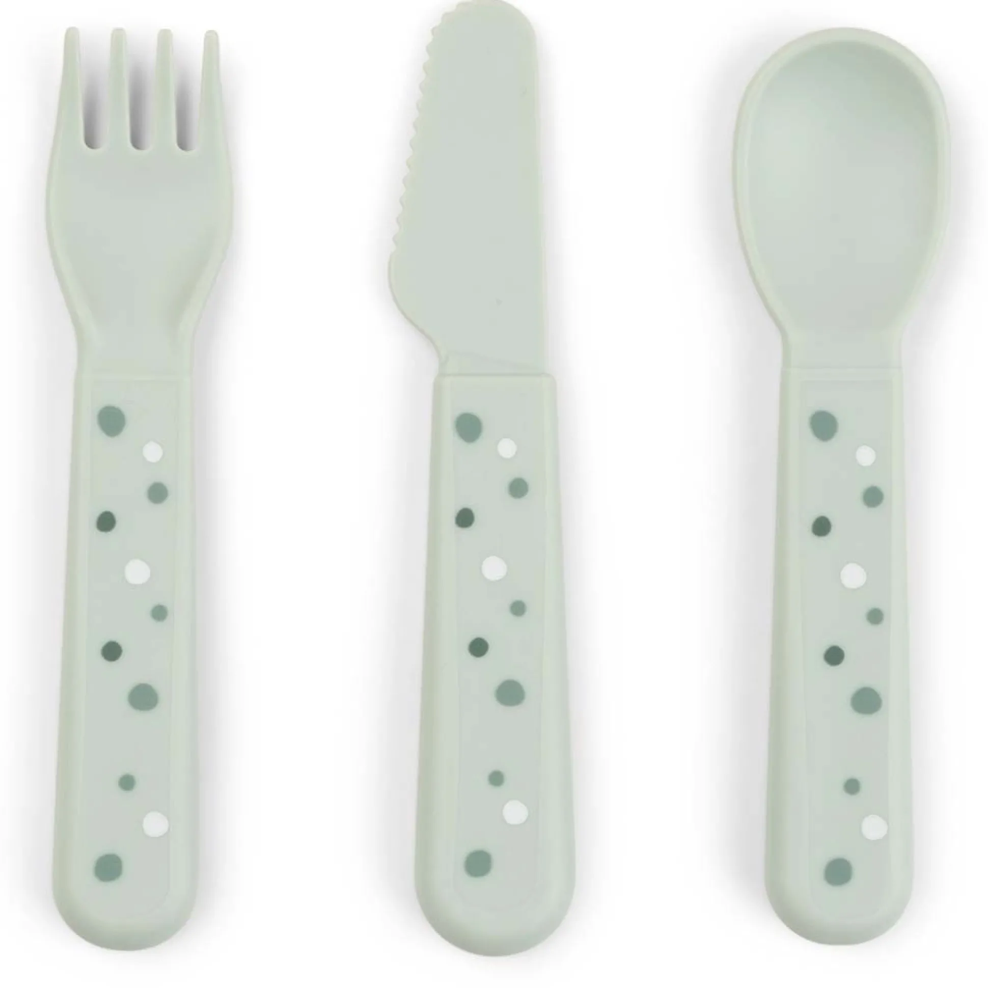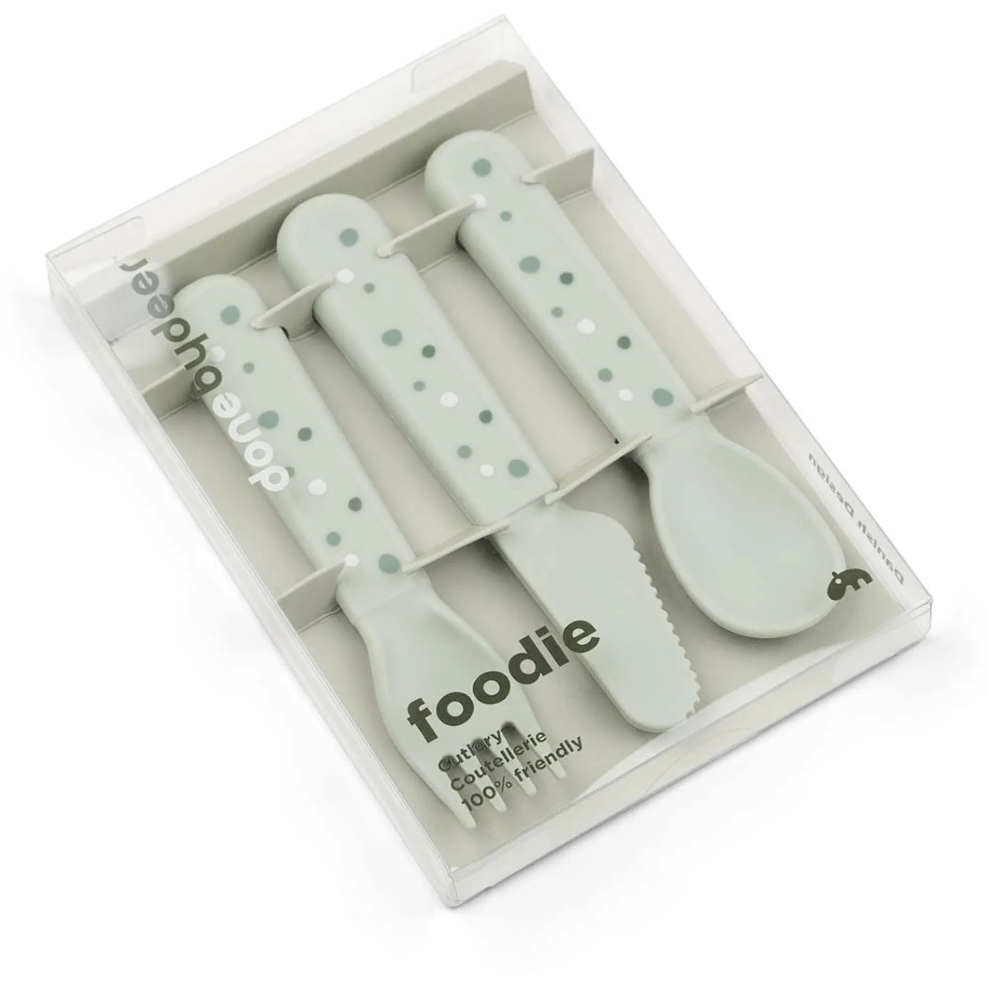 De Foodie bestekset van Done By Deer heeft zachte, afgeronde hoeken waardoor ze veilig zijn voor kindjes die oefenen met zelfstandig eten. Het kinderbestek past perfect in kleine handjes en is getest door kinderen. Deze bestekset voor baby’s en peuters bestaat uit een lepel, vork en mes. Als het bestek zijn dienst heeft bewezen tijdens talloze familiediners, kan het als plastic worden gesorteerd en worden gerecycled. Het zachte materiaal past bij de rest van de Foodie serviescollectie van Done By Deer. De bestekset mag in de magnetron en in de vaatwasser gewassen worden, op max. 70 graden. De set mag niet in de oven.