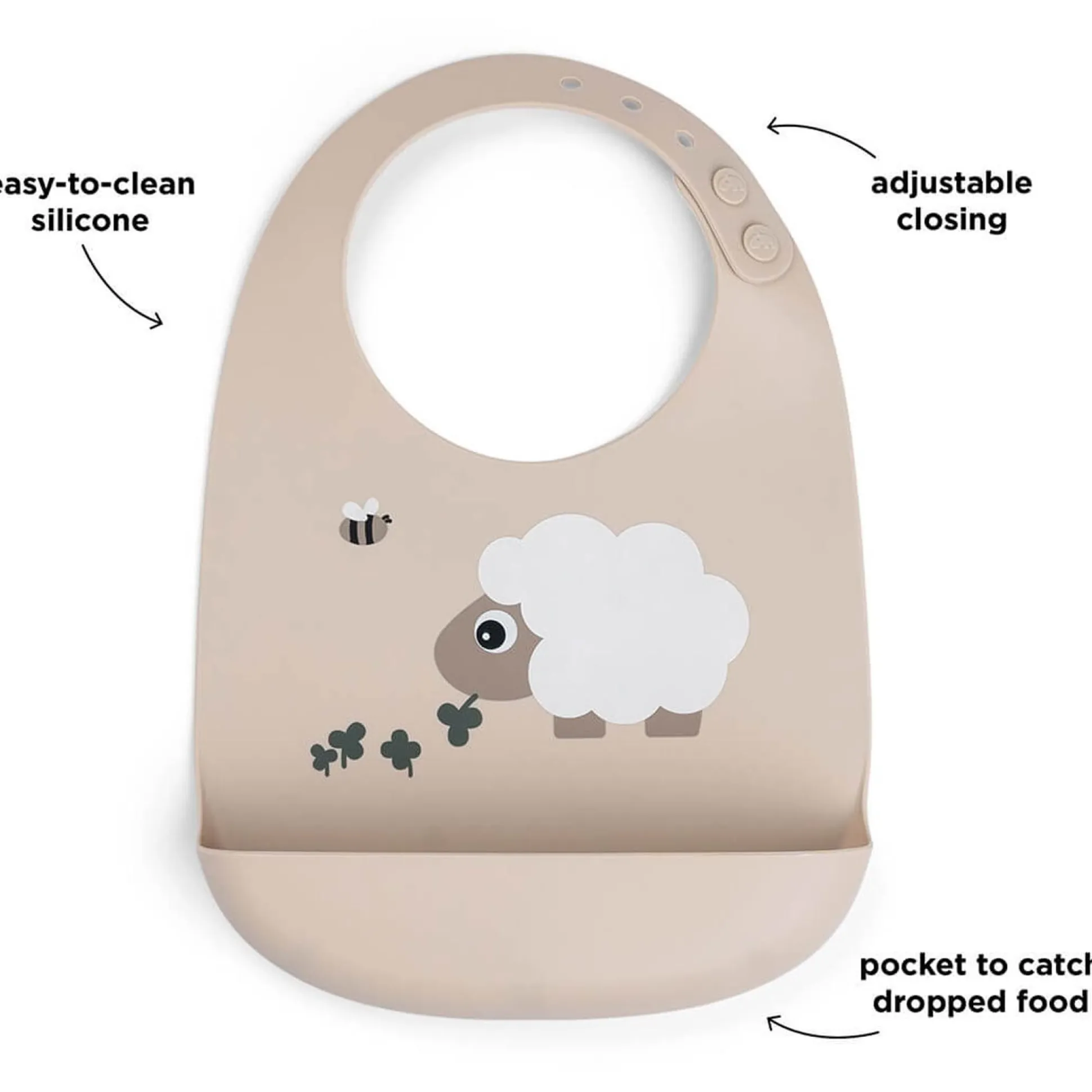 Maak etenstijd makkelijker en netjes met deze vrolijke silliconen slab van Done by Deer. Deze praktische slab is ontworpen met handig opvangbakje om gemorst eten op te vangen. Verkrijgbaar in verschillende kleuren en designs. De slab is gemaakt van zacht en flexibel BPA-vrij siliconen en voelt comfortabel aan voor je kindje. Dankzij de verstelbare drukknoopsluiting past hij altijd goed en groeit hij mee. Het waterafstotende materiaal is eenvoudig schoon te maken: afnemen met een doekje, afspoelen onder de kraan of in de vaatwasser. Afmeting: 27 x 19 x 4cm.