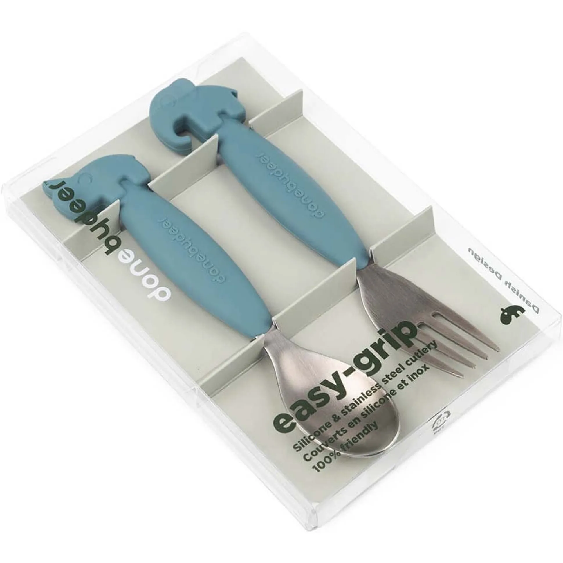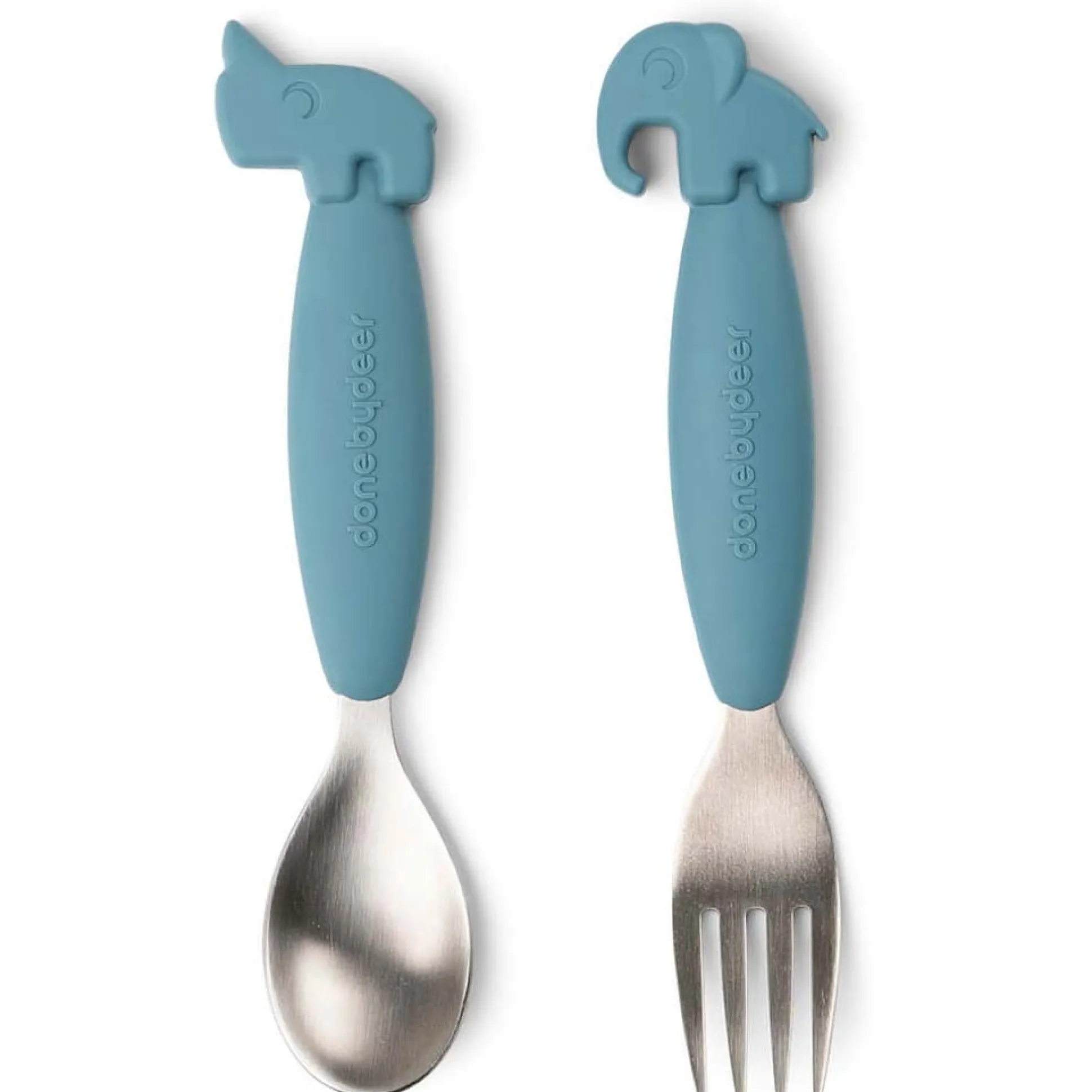 De Easy-grip bestekset van Done By Deer met lepel en vork zorgt voor een stevige grip en helpt je kindje zich te concentreren op het eten. Het perfecte bestek is essentieel om het zelfstandig leren eten leuk te maken. Het bestek heeft zachte siliconen antisliphandvatten en zal snel een favoriete set worden voor jou en je kleintje. Het formaat van de kinderbestekset is perfect voor een zelfstandige peuter die zelf leert eten. De sandkleur vork en lepel passen bij de hele Done by Deer serviescollectie.