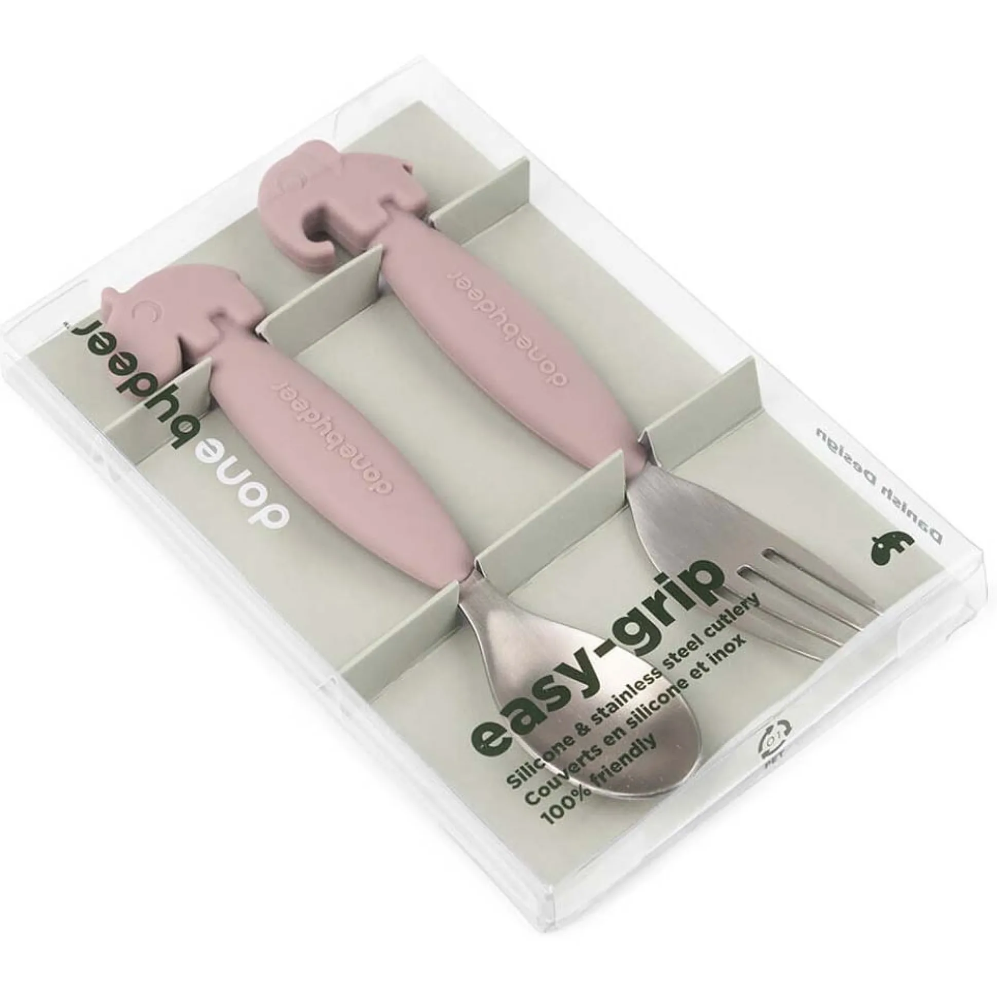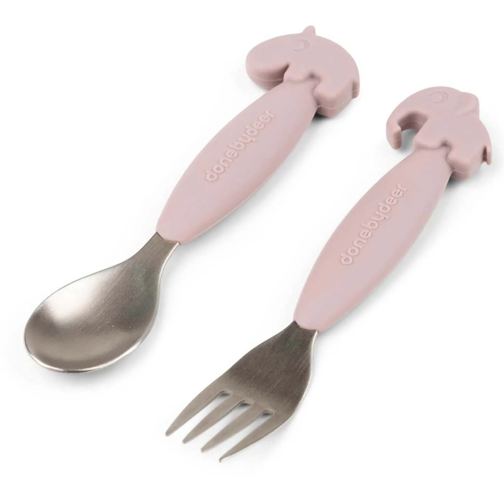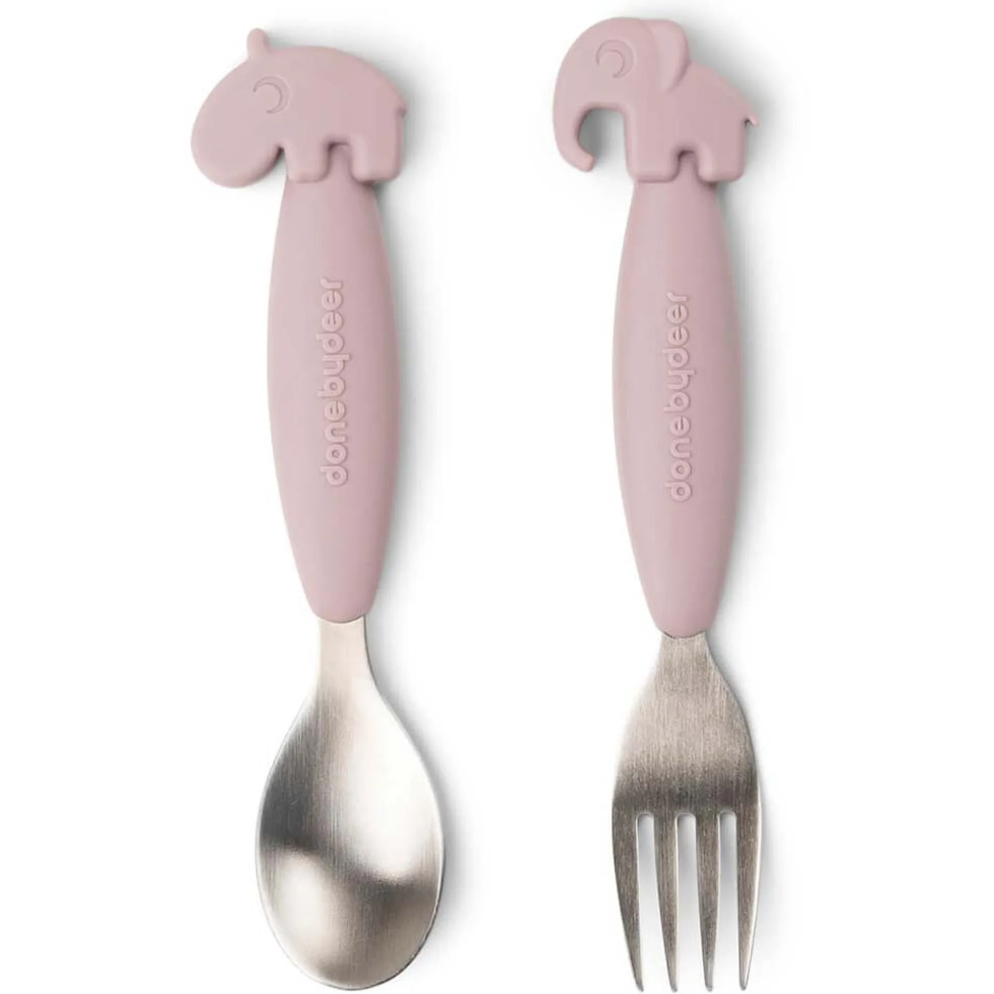 De Easy-grip bestekset van Done By Deer met lepel en vork zorgt voor een stevige grip en helpt je kindje zich te concentreren op het eten. Het perfecte bestek is essentieel om het zelfstandig leren eten leuk te maken. Het bestek heeft zachte siliconen antisliphandvatten en zal snel een favoriete set worden voor jou en je kleintje. Het formaat van de kinderbestekset is perfect voor een zelfstandige peuter die zelf leert eten. De sandkleur vork en lepel passen bij de hele Done by Deer serviescollectie.