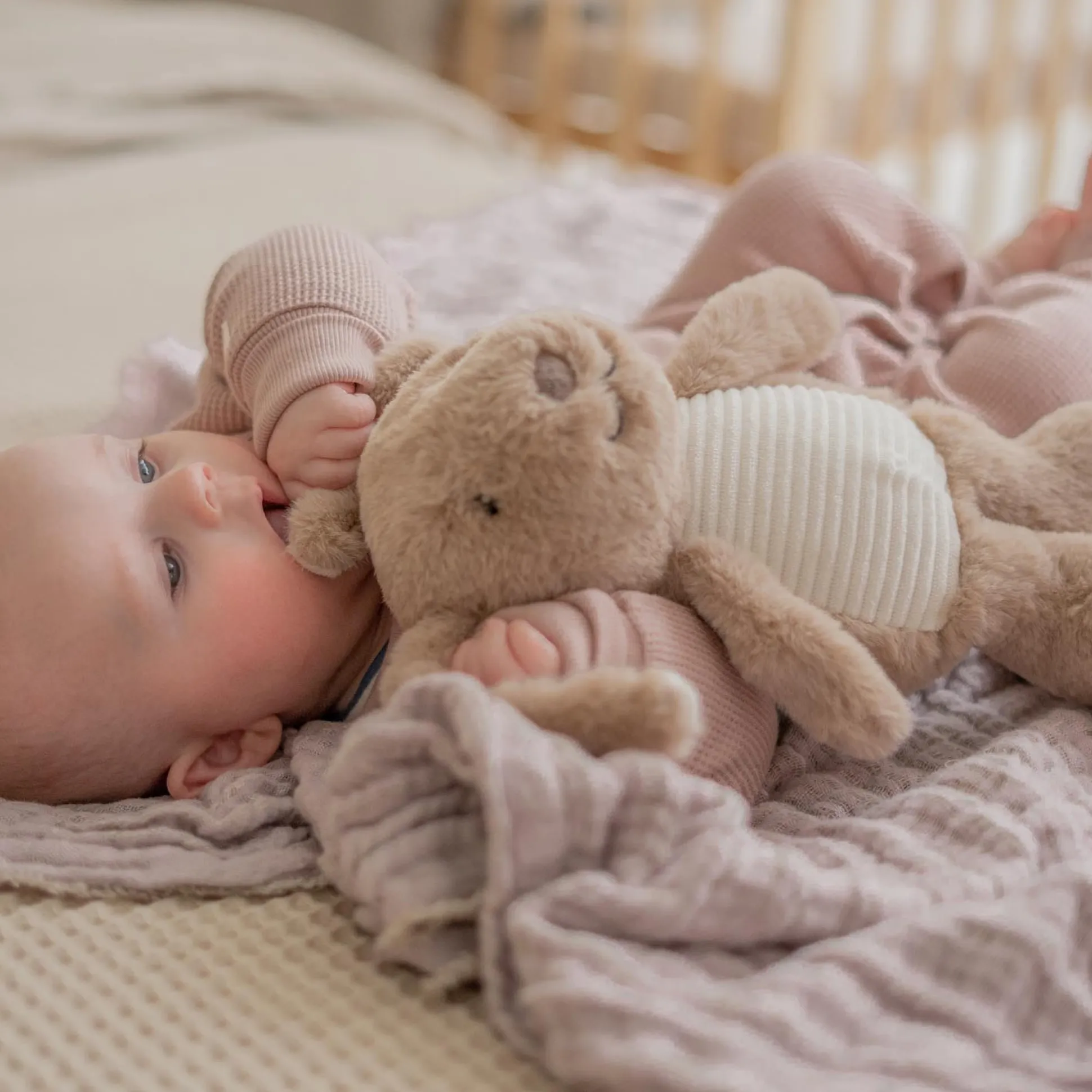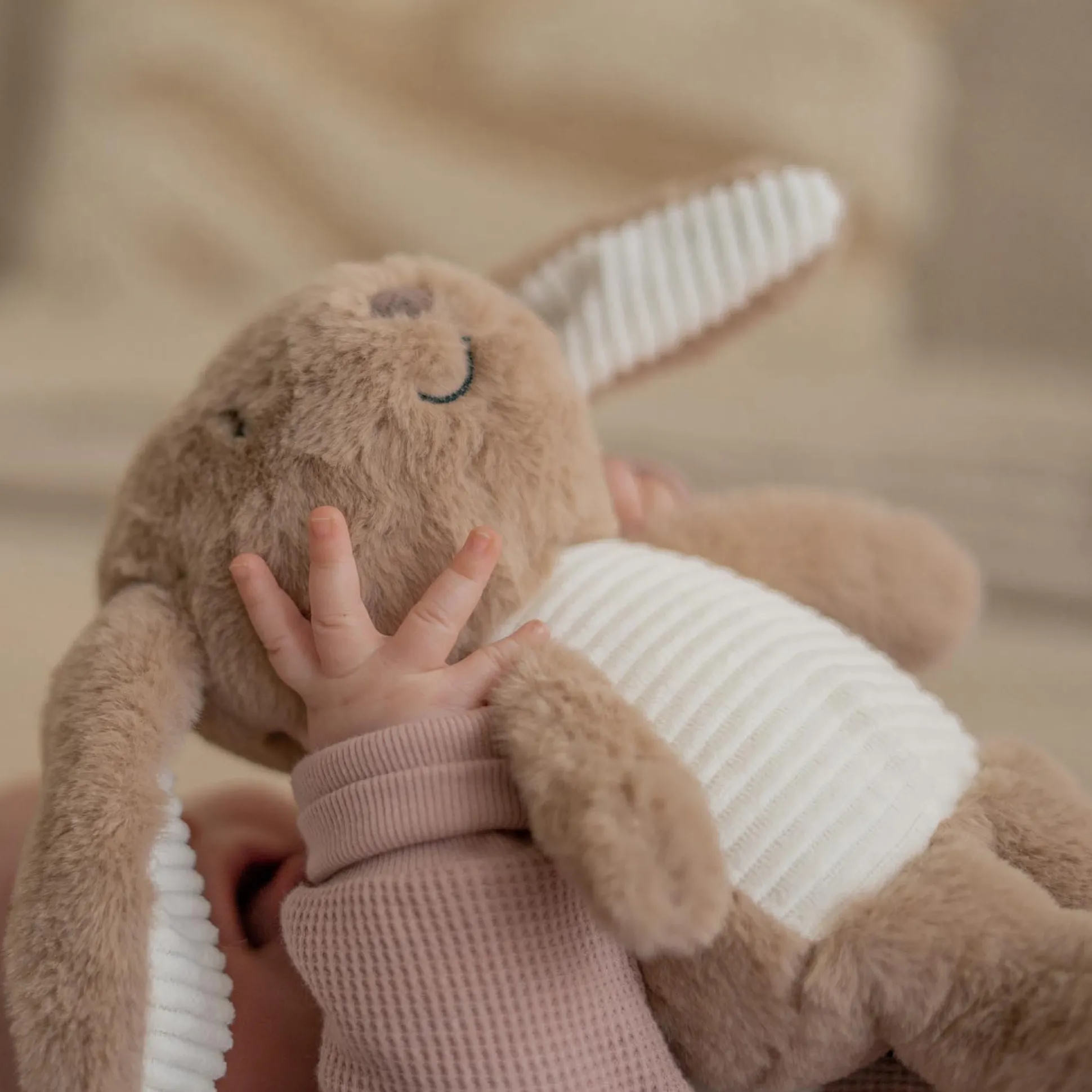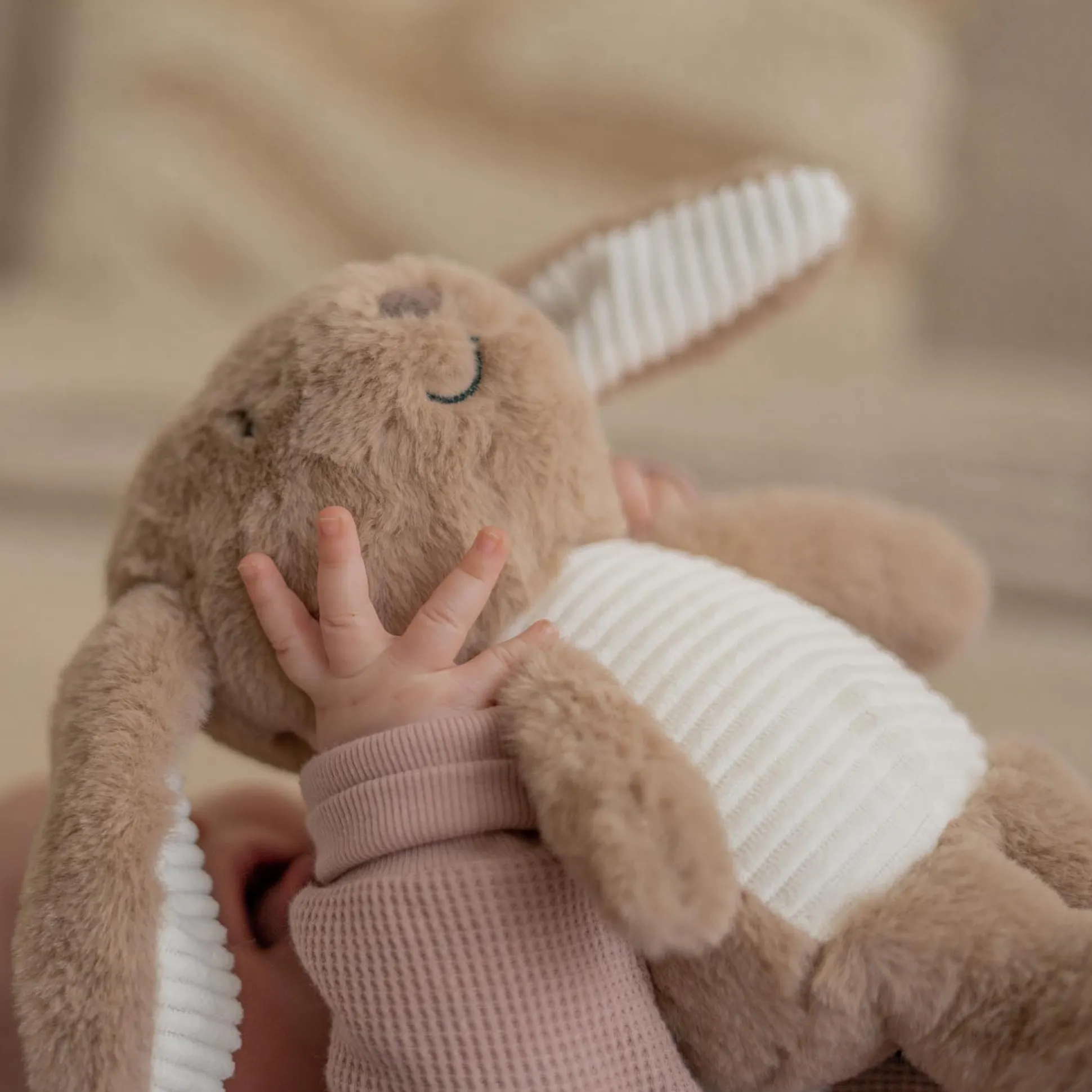 Help jouw kindje lekker slapen met Milo het konijn. Een hartslagknuffel van Flow die rustgevende geluiden maakt zoals de hartslag van mama, waterval geluiden en een aantal diverse melodieen. Het knuffeltje is lekker zacht en kan dus prima in het bedje van jouw kindje liggen. De knuffel gaat aan wanneer jouw kindje huilt en door middel van een zelf in stelbare timer gaat de knuffel ook weer automatisch uit. Het apparaatje is makkelijk op te laden en gaat lang mee.