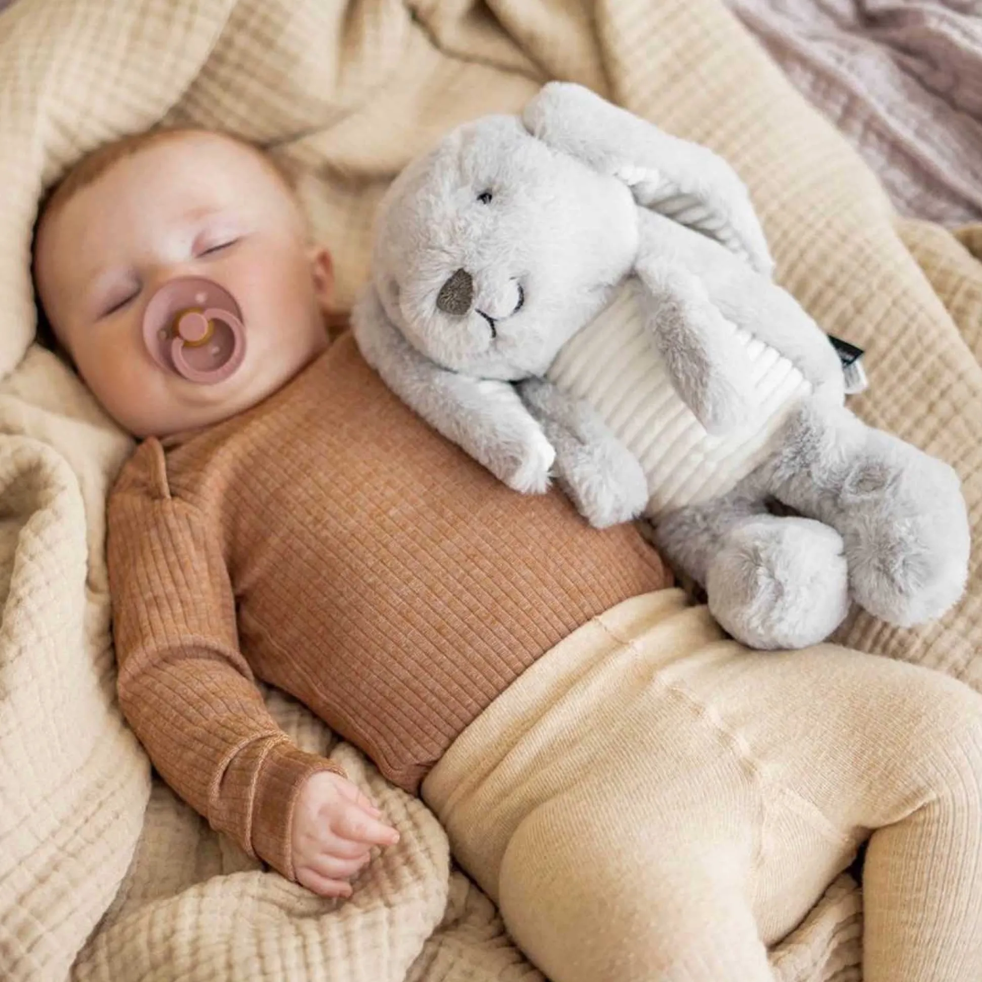Help jouw kindje lekker slapen met Milo het konijn. Een hartslagknuffel van Flow die rustgevende geluiden maakt zoals de hartslag van mama, waterval geluiden en een aantal diverse melodieen. Het knuffeltje is lekker zacht en kan dus prima in het bedje van jouw kindje liggen. De knuffel gaat aan wanneer jouw kindje huilt en door middel van een zelf in stelbare timer gaat de knuffel ook weer automatisch uit. Het apparaatje is makkelijk op te laden en gaat lang mee.