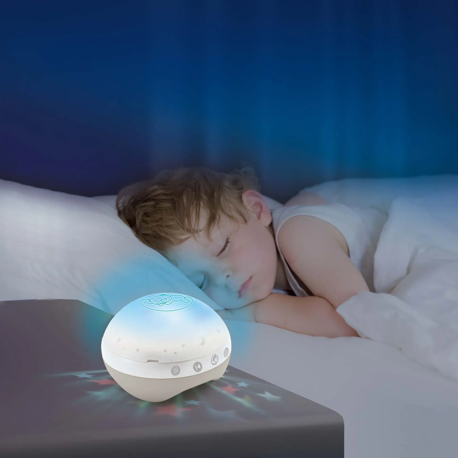 Van kalmerende melodietjes tot een betoverende sterrenhemel: deze muziekmobiel groeit mee met je kindje. In de eerste maanden zorgen rustgevende melodietjes, natuurgeluiden en zacht licht voor een rustige sfeer. Daarna verandert de mobiel in een nachtlamp en projector die boven het bedje bevestigd kan worden. In de derde fase kan de projector los worden gebruikt om een sterrenhemel op het plafond te toveren. Met de handige auto-timer van twintig minuten en het instelbare licht en geluid maak je van elk slaapmoment een magisch ritueel. Geschikt vanaf 0 maanden t/m 5 jaar.