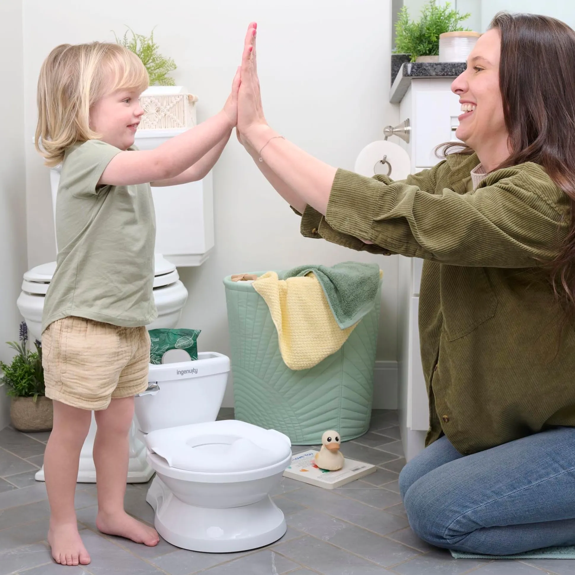 Zindelijkheidstraining is makkelijker (en leuker) met de Summer by Ingenuity My Size Potty Pro. De My Size Potty Pro is een peutertoilet dat eruitziet en ‘werkt’ als een toilet voor volwassenen. De chromen hendel van het potje maakt een realistisch doorspoelgeluid als beloning voor je kleintje. Het afneembare zitje kan gebruikt worden als wc-bril voor peuters en zorgt voor een soepele overstap naar het volwassen toilet. Het ingebouwde opbergvak is ruim genoeg voor boekjes, een tablet, doekjes en alles wat je kleintje nodig heeft tijdens de zindelijkheidstraining. Met het uitneembare potje en de geïntegreerde spatbescherming is de My Size Potty Pro gemakkelijk schoon te maken – ideaal voor knoeimomenten tijdens de zindelijkheidstraining. De gemonteerde afmetingen zijn 36,20 cm x 31,12 cm x 40,26 cm. Dit peuterpotje is geschikt voor kinderen vanaf 18 maanden of tot 22,67 kg.