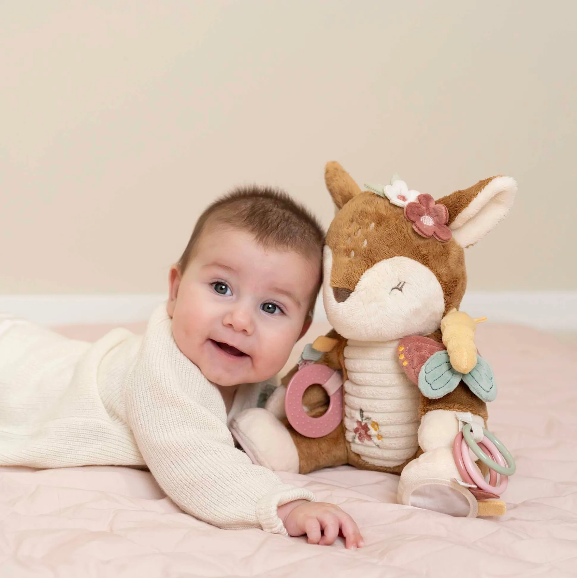 Knuffel en speel! Dit lieve hertje van Little Dutch belooft meer dan alleen maar knuffels. Ontdek alle activiteiten die het verbergt. Het ratelende geluid, de knisperende vlinder op de schouder, en labels en bloemen om mee te friemelen. De ringen om het pootje, de spiegel onder één voetje, – zoveel details om de nieuwsgierigheid van je kleintje te stimuleren. En na al dat spelen, inspireert het schattige hertje de zoetste dromen over de feeëntuin Fairy Garden.
