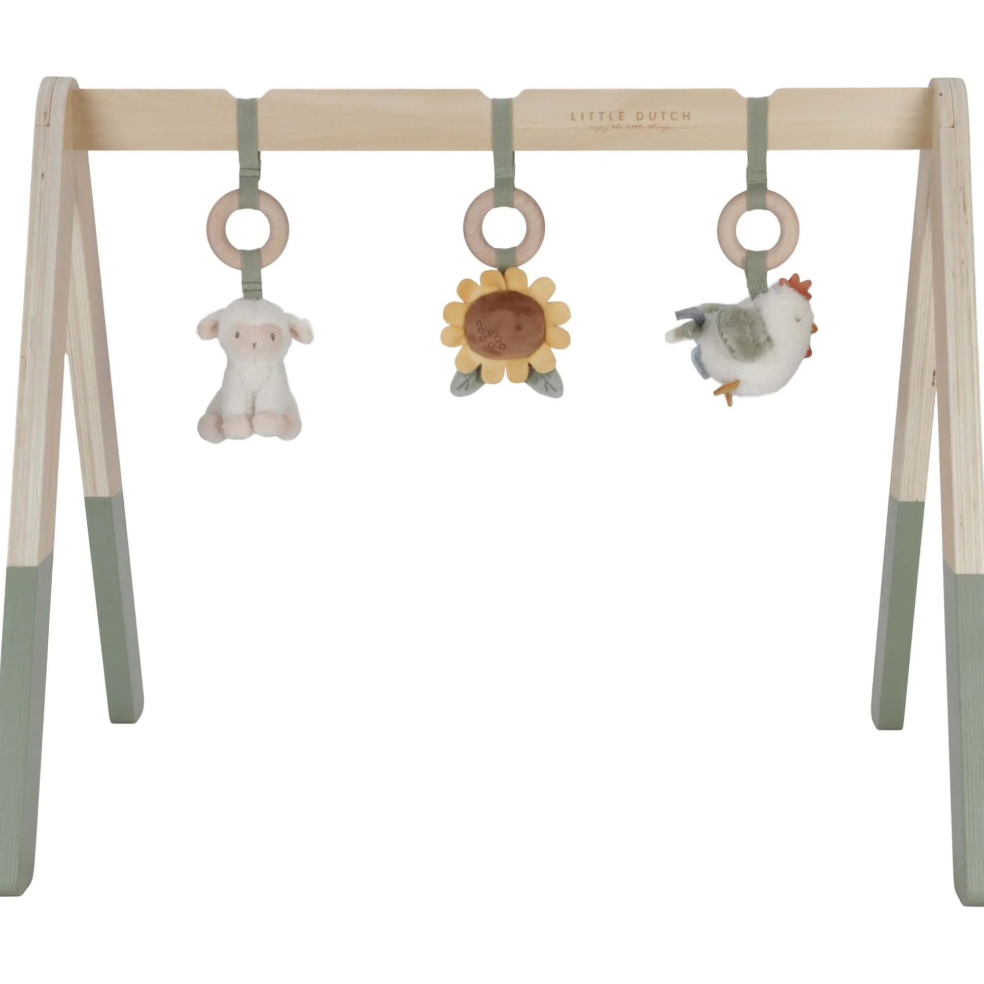 Met deze leuke babygym van Little Dutch met thema Little farm vermaakt je kindje zich kostelijk. Er zijn drie verschillende activiteitenspeeltjes waaronder een vrolijk schaapje, een lief kipje en een kleurrijke bloem. De babygym ontwikkelt de hand-oogcoördinatie, verbetert de motoriek en stimuleert de zintuigen elke keer dat je kindje naar een van de speeltjes grijpt. WAARSCHUWING: Om te voorkomen dat je kindje verstrikt raakt en zich bezeert is eht belangrijk dat het speelgoed verwijderd wordt wanneer je kindje op handen en voeten begint te kruipen. Te monteren door een volwassene. Geschikt voor 0-6 maanden