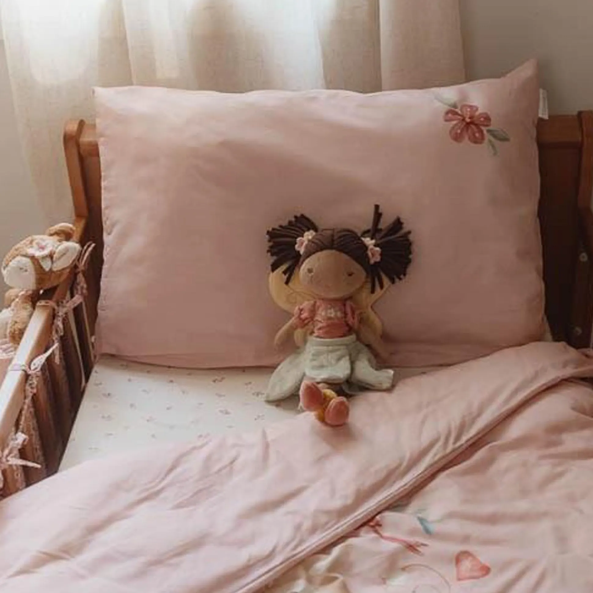 Voeg een vleugje design toe aan de kinderkamer met een prachtig opgemaakt bed. Het zachte dekbedovertrek is gemaakt van 100% biologisch katoen in een effen Blossom kleur versierd met een speels tafereel van een fleurige tuin. Zowel de kussensloop als het dekbedovertrek zijn comfortabel, mooi afgewerkt en hebben een goed ademend vermogen. Het formaat van het dekbedovertrek is 110 x 140 cm en de kussensloop is 40 x 60 cm. Het beddengoed mag gewassen worden op 40 graden.