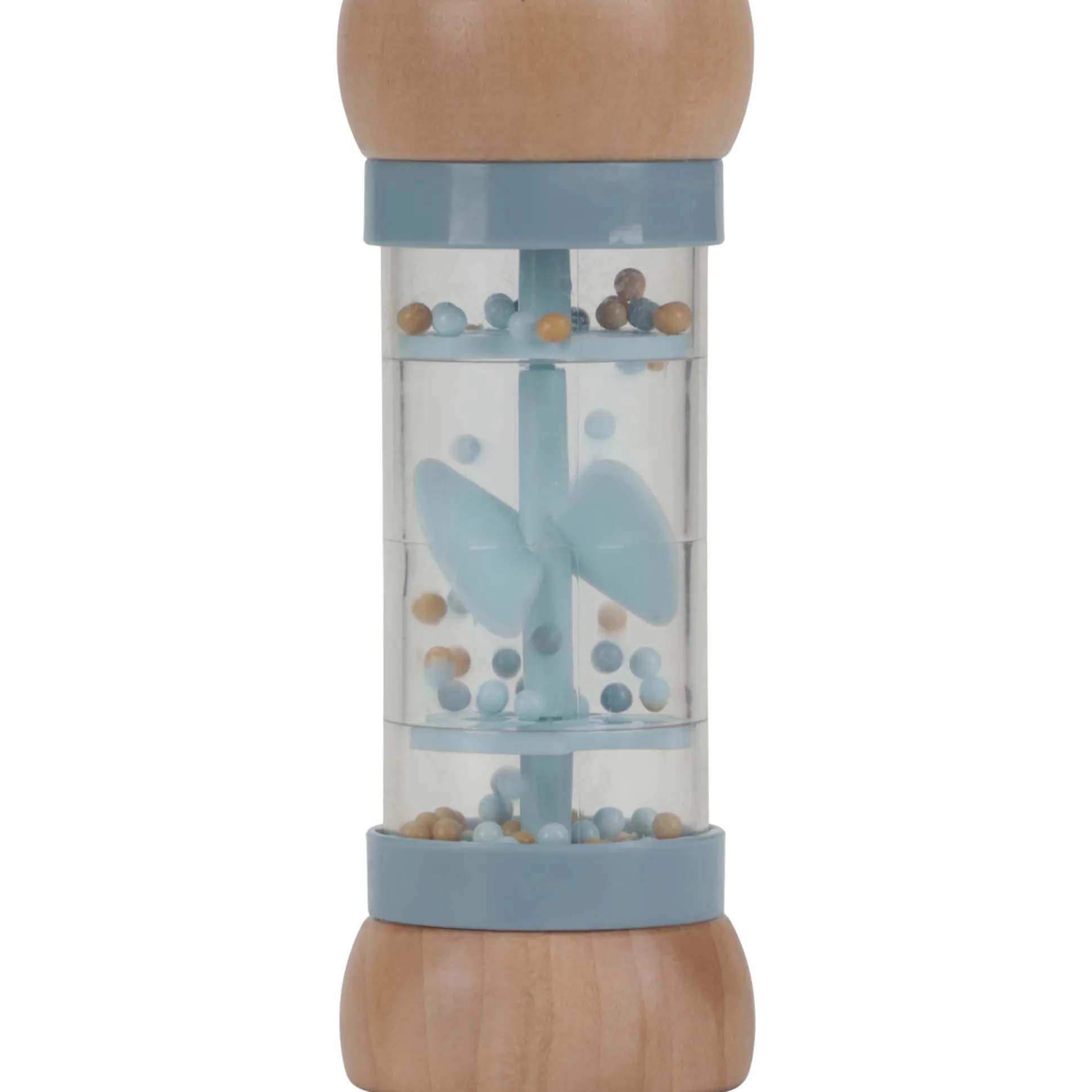 Schud en rammel! Draai de regenrammelaar om en luister naar de rustgevende druppelgeluidjes van de balletjes die van de ene naar de andere kant van de regenmaker bewegen. Het stimuleert de zintuiglijke ontwikkeling en het muzikale talent van de baby. De balletjes, vallen door kleine openingen in de buis en laten de propeller draaien, wat resulteert in een aangenaam geluid. De regenrammelaar is ontworpen voor kleine handjes en ligt lekker in de hand.