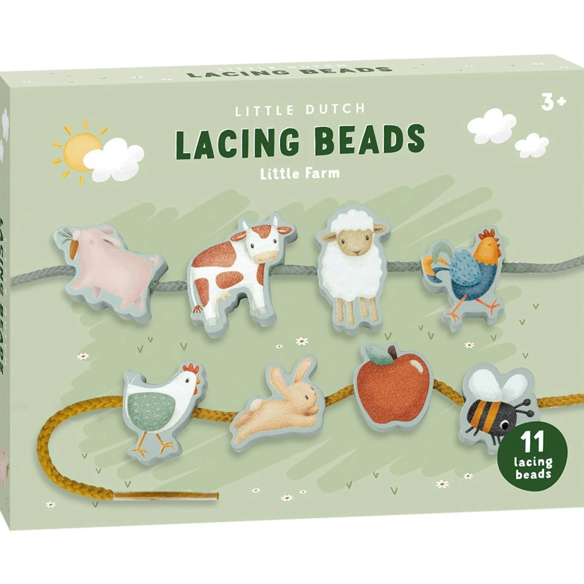 Beleef telkens een nieuw avontuur op de boerderij met deze kartonnen rijgkralen van Little Dutch. Deze set bestaat uit 5 grote, stevige kartonnen kaarten, met afbeeldingen van o.a. een tractor, schaap en koe en zijn extra groot en hebben een ruime uitsparing zodat kleine handjes ze makkelijk aan een veter kunnen rijgen. Inclusief 2 veters om aan te rijgen.Aantal delen: 13Geschikt voor 36 maanden en ouder.Materiaal: houtLeerpunten: bevordering oog-handcoördinatie, stimulering fijne motoriek.
