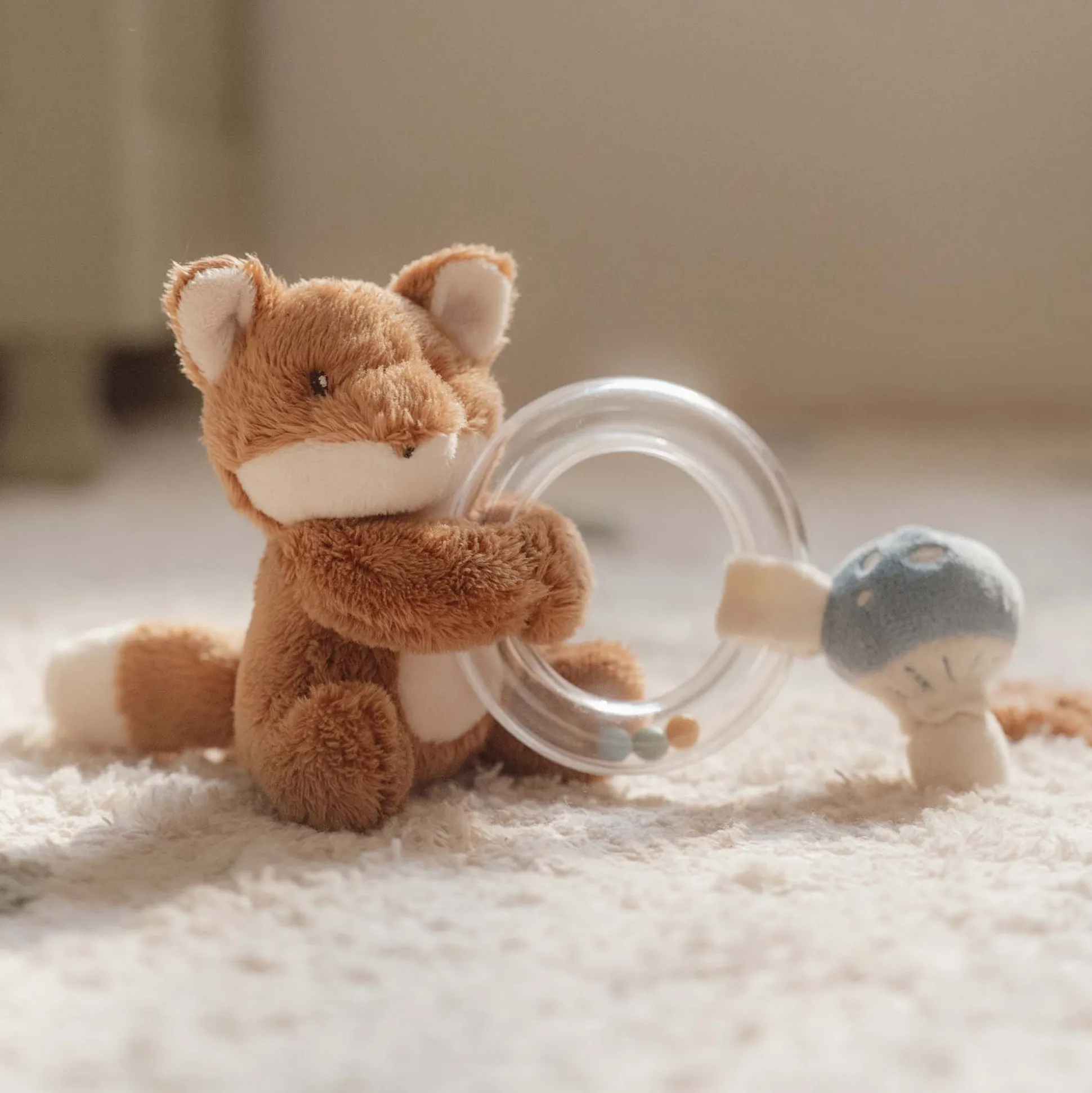 Grijp, draai en schud! Het lieve vosje met zijn zachte vacht en kleine staart nodigt je uit om te spelen en deze ringrammelaar te laten horen. De kleine paddenstoel heeft hij speciaal voor jou geplukt om mee te kroelen. De transparante ring is gevuld met 3 kleine kraaltjes die rammelen als je kindje ermee speelt. Dit aantrekkelijke babyspeeltje prikkelt niet alleen je baby¿s zintuigen en nieuwsgierigheid, maar bevordert ook de hand-oogcoördinatie. De ringrammelaar komt uit de Forest Friends-collectie van Little Dutch. Wassen: handwas.