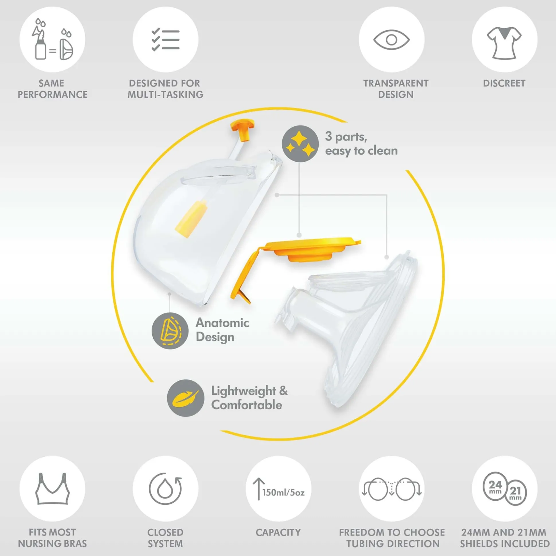 Ervaar hands-free kolven met Medela’s Hands-free CollectionCup Set, compatibel met je Medela kolf! Transformeer je klassieke dubbele kolf (Freestyle Hands-Free, Freestyle Flex & Swing Maxi) tot een hands-free kolf voor optimale flexibiliteit. Kolven wordt discreet en gemakkelijk dankzij de anatomisch gevormde, lichtgewicht cups die op de meeste borstvormen en borstvoedingsbh’s passen. Ontworpen om je borst niet te bedrukken, zodat je natuurlijke borstvorm behouden blijft. Voorzien van goed onderzochte Medela-technologieën zoals borstschilden met een hoek van 105 graden. De set is gebruiksvriendelijk met slechts drie delen om schoon te maken en is vaatwasmachinebestendig. Ervaar comfort en gemak met deze innovatieve set!