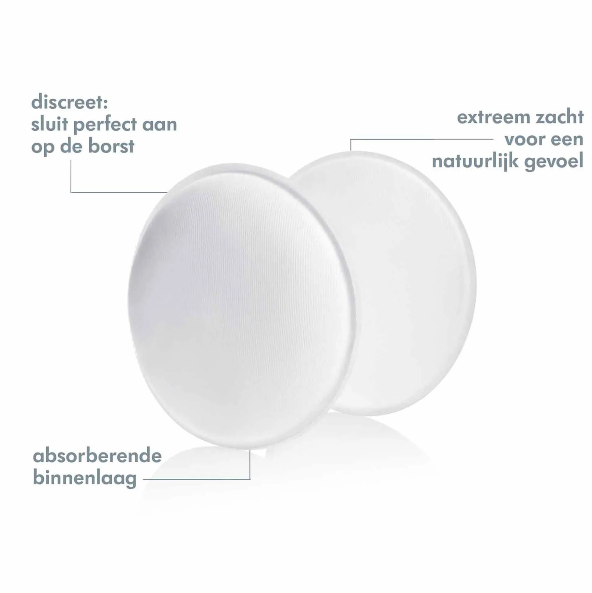 Blijf droog en zelfverzekerd met de wasbare zoogkompressen van Medela. Deze wasbare zoogkompressen: zijn extreem zacht met een comfortabele buitenlaag en absorberende binnenlaag; sluiten perfect aan en zijn discreet te dragen onder je kleding; bevatten een ultrasoon gelast stiksel rondom de randen om ervoor te zorgen dat de melk in het zoogkompres blijft; kunnen tot 50 keer worden gewassen op 40 tot 60 °C; zijn ultradun en gevormd voor een natuurlijk en zacht gevoel; geschikt voor normale hoeveelheden lekkende moedermelk. De wasbare zoogkompressen van Medela zijn verkrijgbaar in pakken van vier herbruikbare kompressen.