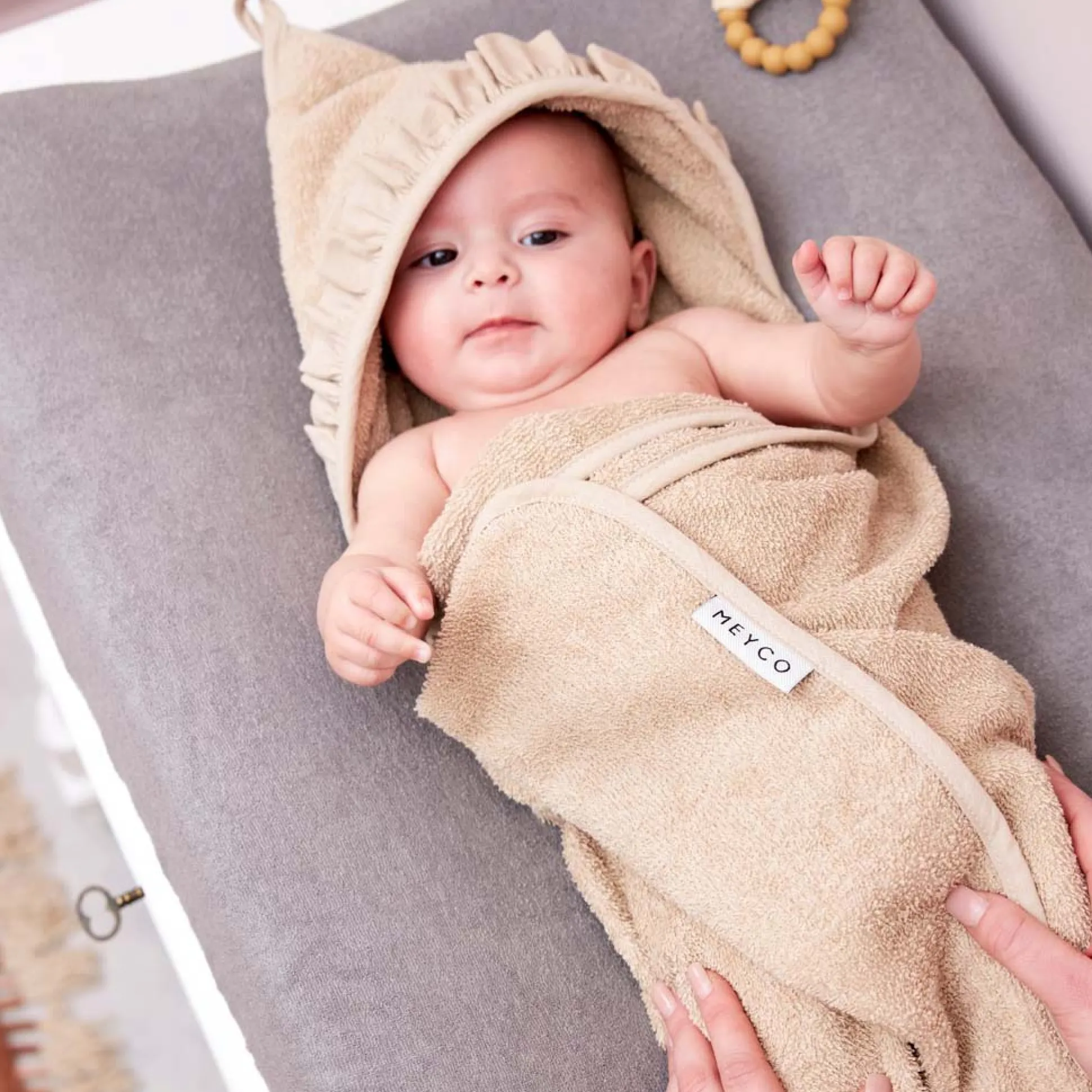 De Meyco badcape ruffle is gemaakt van heerlijk zacht katoenen badstof. Na het badderen, douchen of tijdens het voeden wikkel je kindje in deze cape met capuchon waardoor je kindje heerlijk comfortabel, warm en geborgen ligt. Aan de capuchon zitten ruches voor een leuk effect. Wassen op maximaal 40 graden. Afmeting: 80 x 80 cm.