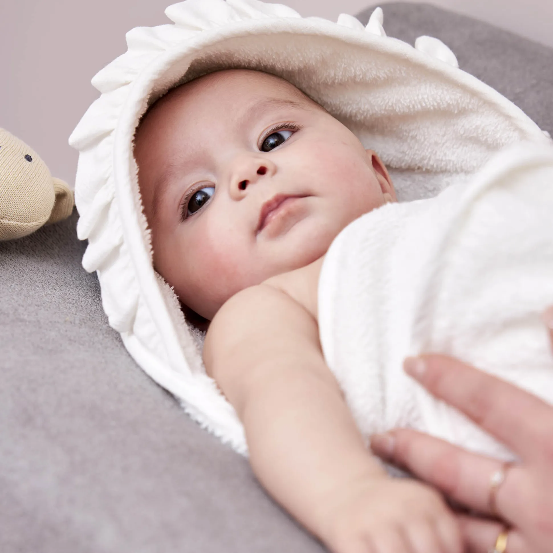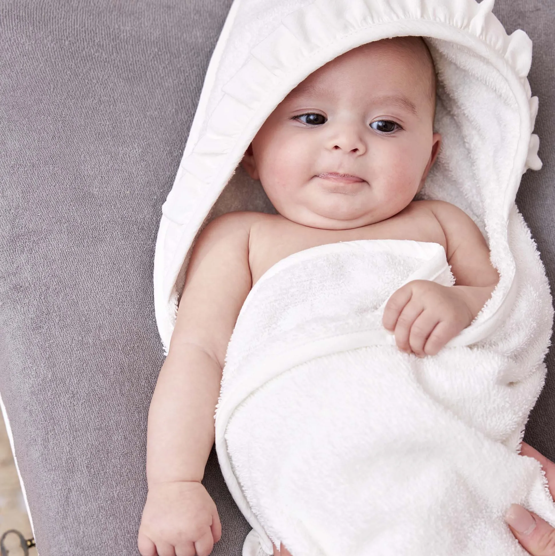De Meyco badcape ruffle is gemaakt van heerlijk zacht katoenen badstof. Na het badderen, douchen of tijdens het voeden wikkel je kindje in deze cape met capuchon waardoor je kindje heerlijk comfortabel, warm en geborgen ligt. Aan de capuchon zitten ruches voor een leuk effect. Wassen op maximaal 40 graden. Afmeting: 80 x 80 cm.