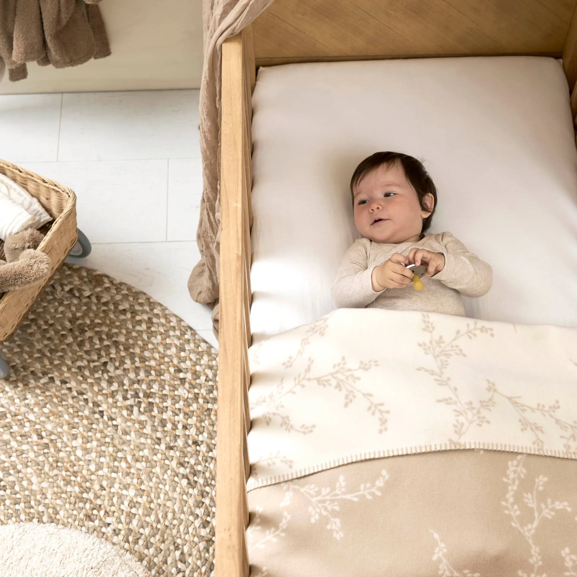 Jouw kleine slaper geniet van héél veel extra comfort en warmte met deze Meyco Baby Branches Deken. Het rustige, natuurlijke takjes printje met een zachte sand kleurige achtergrond match je gemakkelijk met de rest van de babykamer. Deze deken heeft de geweldige mogelijkheid om hem op twee manieren te gebruiken. De ene kant heeft een warme, zandkleurige achtergrond met een subtiel wit takjespatroon. Draai het dekentje om en je krijgt een frisse, witte achtergrond met hetzelfde, speelse patroon. Zo kan je gemakkelijk variëren en past het dekentje bij iedere inrichting. Gebruik de deken op een Meyco Baby laken om het bedje op te maken. Het dekentje, gemaakt in Duitsland, bestaat uit 100% katoen dat eerst wordt geweven en daarna geruwd. Hierdoor voelt het dekentje zo zacht als fleece, maar heeft het de fijne eigenschappen van katoen zoals goede ventilatie voor een fris slaapklimaat. De deken heeft TOG-waarde 1.0. Afmeting: 75x100cm.