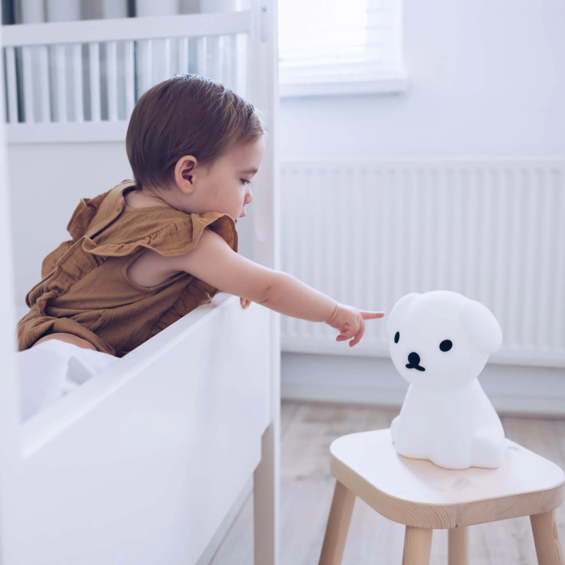 Snuffy de hond is een van de vriendjes van Nijntje. Deze Snuffy lamp is dimbaar en kan dus worden gebruikt voor verschillende momenten. Bijvoorbeeld bij het voorlezen van een boekje, voor een nachtvoeding of als waaklichtje tijdens de nacht. De Snuffy lamp is draadloos en kan dus gerust mee uit logeren. Het is gemaakt van een zachte siliconen, wordt geleverd met een USB-oplaadkabel en is 23 cm hoog.