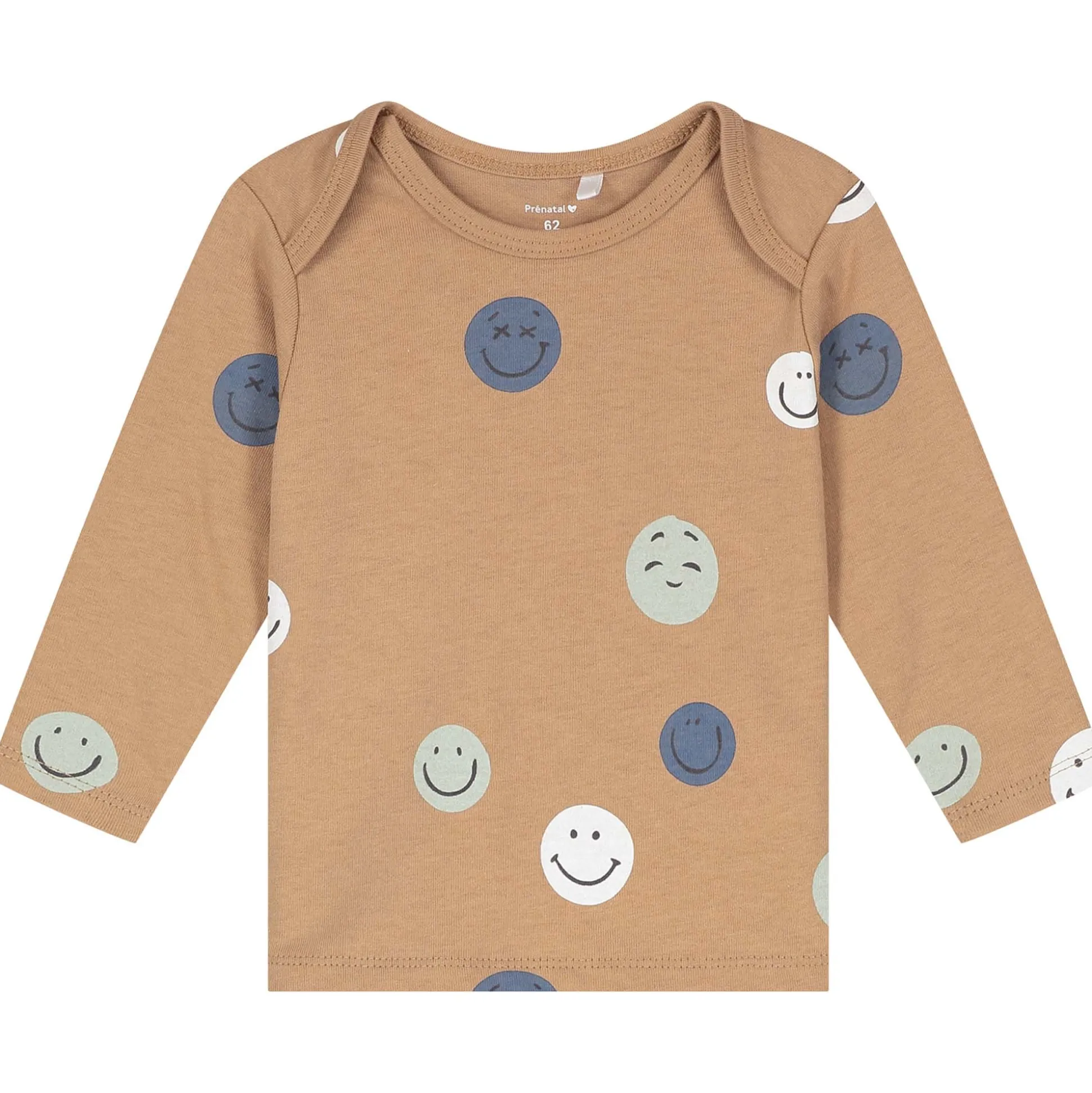Deze Prénatal baby pyjama is gemaakt van biologisch katoen. De pyjama heeft een bruine ondergrond met een grappige smiley all over print. De pyjama is gemakkelijk aan en uit te trekken door de envelophals voor babymaten en de drukknopen op de schouders voor peutermaten. De pyjama is goed te combineren met de rest van de Prénatal collectie en is verkrijgbaar in de maten 56 t/m 122. Kwaliteit: 100% biologisch katoen. Binnenstebuiten wassen op 40 graden met gelijke kleuren.