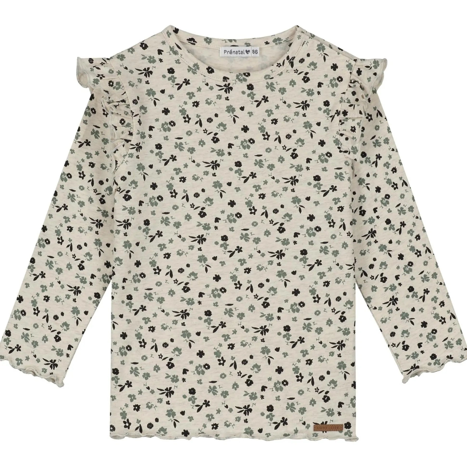 Dit Prénatal baby shirt is gemaakt van een fijne katoenen kwaliteit. Het shirt heeft lange mouwen en een ronde hals. Het shirt is voorzien van een all-over bloemenprint en heeft leuke ruffles op de schouders. Het shirt is goed te combineren met de rest van de Prénatal collectie en is verkrijgbaar in de maten 56 t/m 116. Kwaliteit: 95% biologisch katoen, 5% elastaan. Binnenstebuiten wassen op 40 graden met gelijke kleuren. Dit product is getest op schadelijke chemicaliën en gecertificeerd volgens standaard 100 door OEKO-TEX® BJ020 169567 TESTEX.