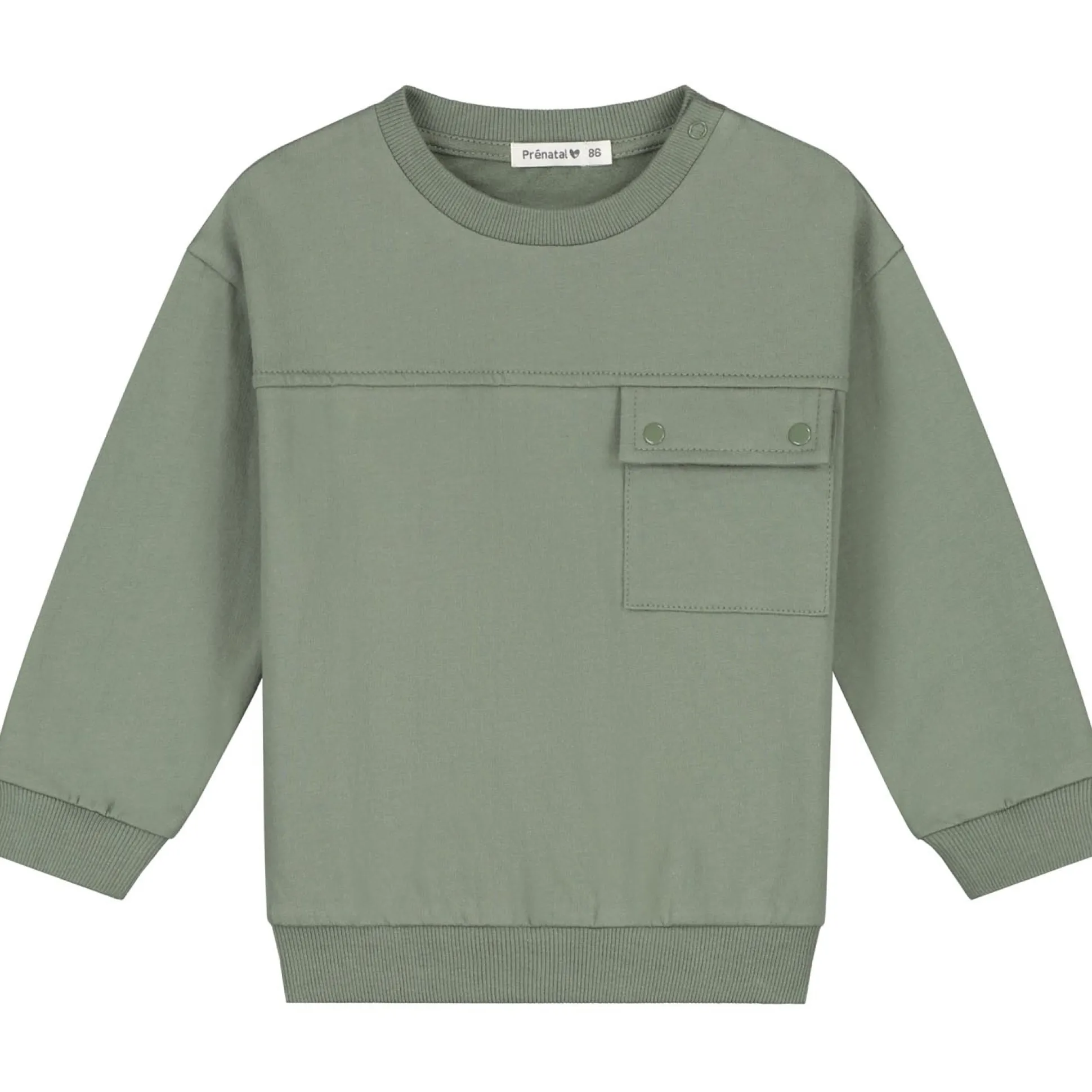 Deze Prénatal sweater is gemaakt van een fijne katoenen kwaliteit. De sweater heeft een ronde hals met een knoopsluiting tot en met maat 98, hierdoor is deze gemakkelijk aan en uit te trekken bij je kindje. De sweater is voorzien van een borstzakje. De sweater is vergelijkbaar in twee kleuren: khaki groen en donkerblauw. Verkrijgbaar in de maten 56 t/m 122. Kwaliteit: 100% biologisch katoen. Binnenstebuiten wassen op 40 graden met gelijke kleuren.