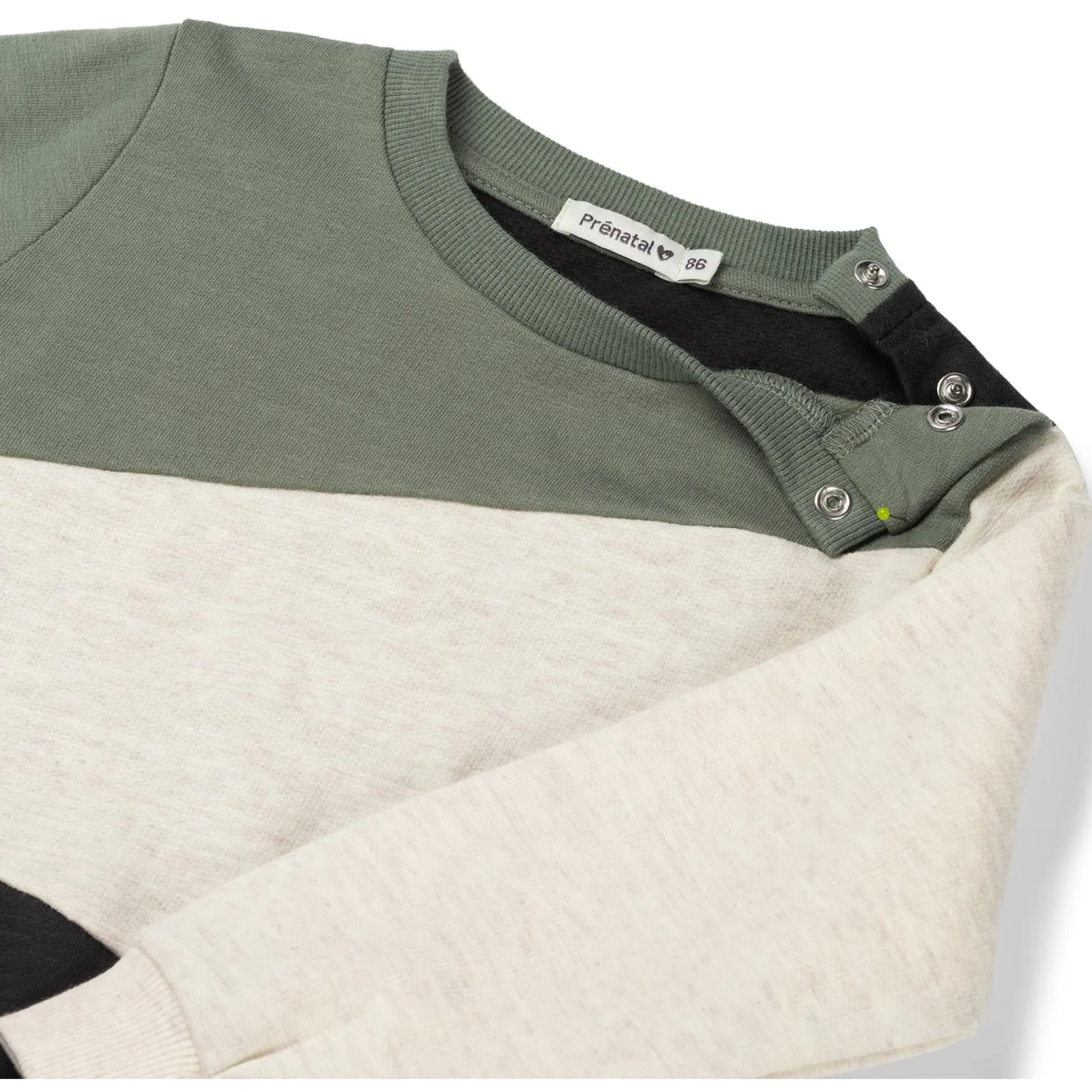 Deze Prénatal sweater is gemaakt van een fijne katoenen kwaliteit. De sweater heeft een ronde hals met een knoopsluiting tot en met maat 98, hierdoor is deze gemakkelijk aan en uit te trekken bij je kindje. De sweater is voorzien van een colourblock in het khaki groen. Verkrijgbaar in de maten 56 t/m 122. Kwaliteit: 100% biologisch katoen. Binnenstebuiten wassen op 40 graden met gelijke kleuren.