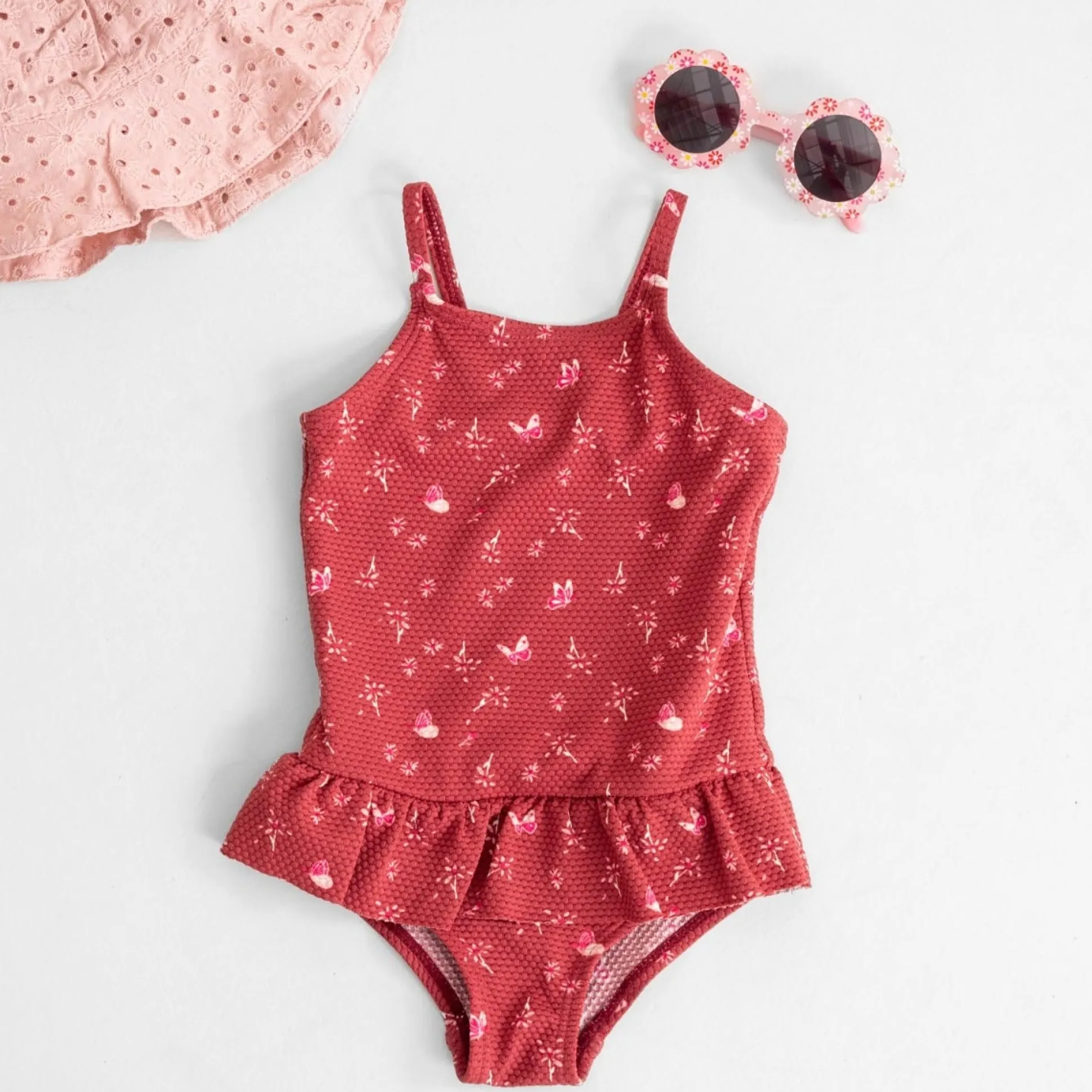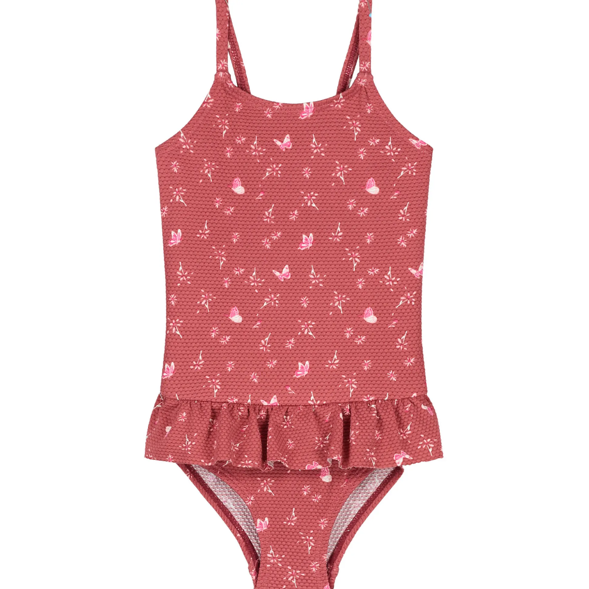 Dit Prénatal badpak is gemaakt in een fijne kwaliteit honeycomb kwaliteit en heeft een wijnrode kleur met een klein bloemen en vlinder print. Het badpak heeft een ruffle op de heup. Daarnaast is het badpak gemaakt van een erg rekbare stof waardoor hij comfortabel zit bij je kleintje. Verkrijgbaar in de maten 62/68 t/m 122/128. Kwaliteit: 95% polyamide en 5% elastaan. Binnenstebuiten wassen op 30 graden met gelijke kleuren.