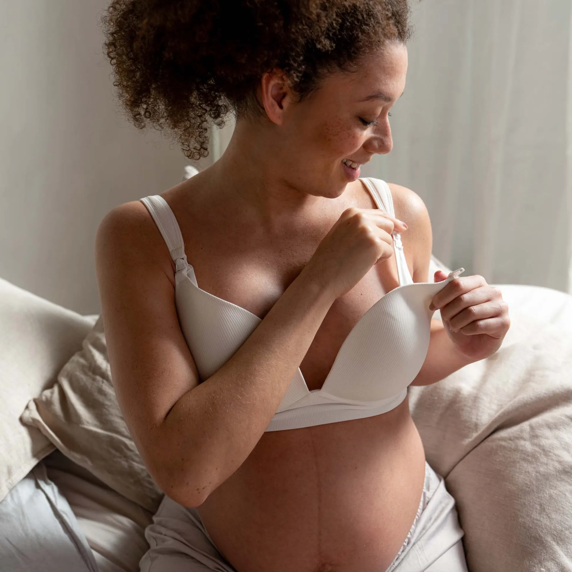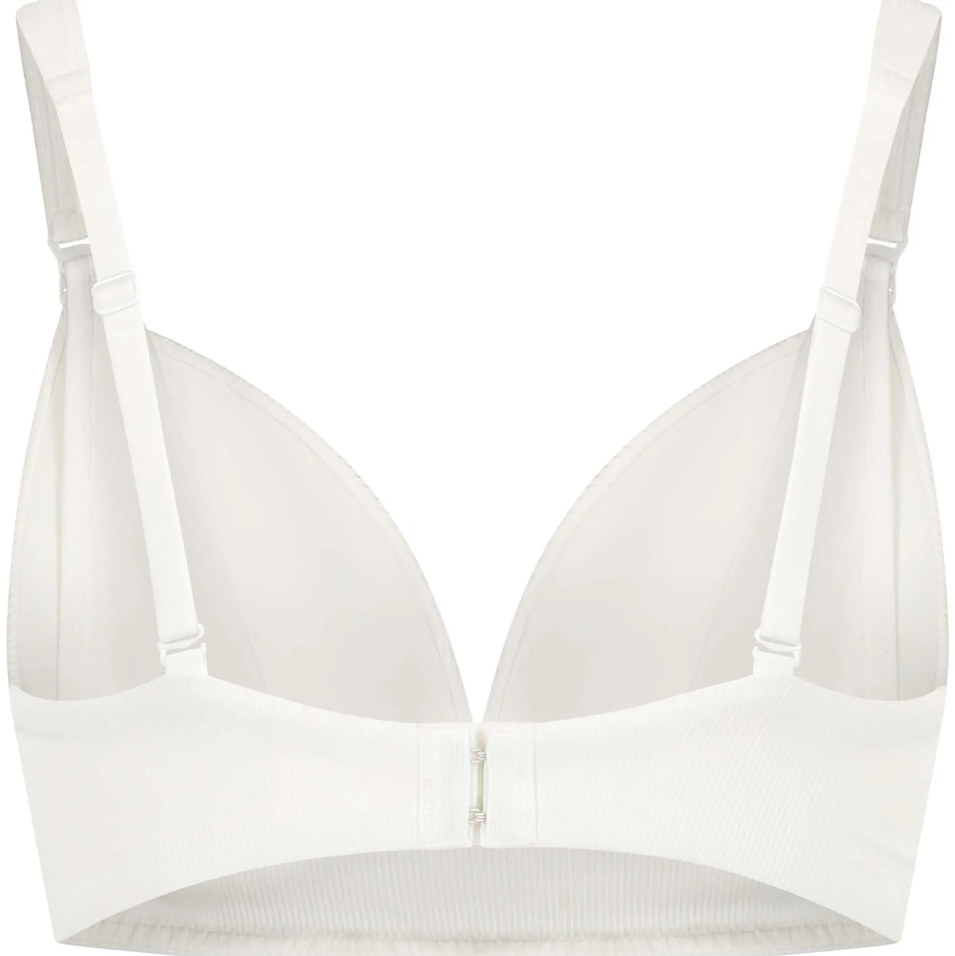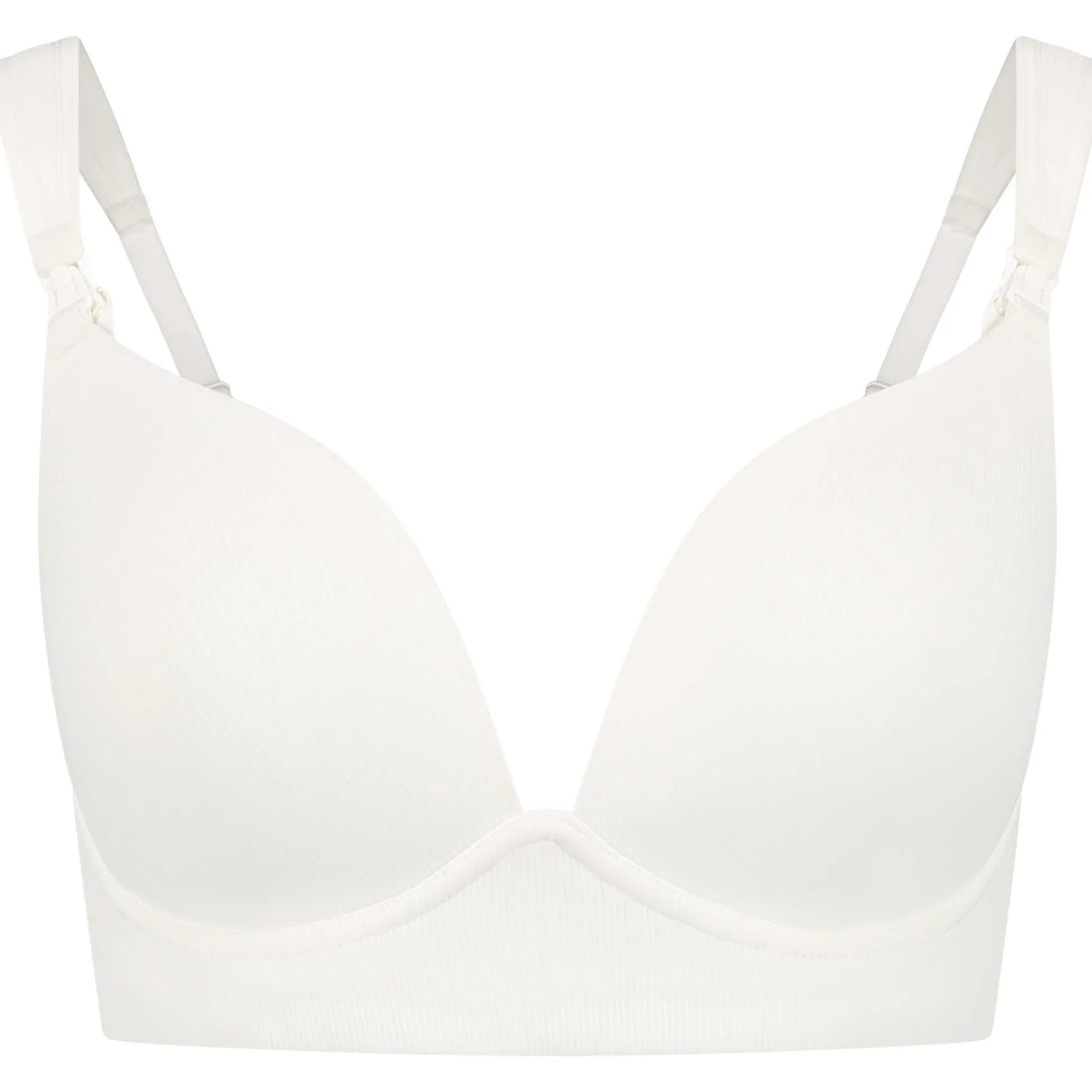 Prenatal beugelloze voedingsbh. Deze voedingsbh heeft een mooie V-shape. Dankzij het zachte, elastische materiaal zul je deze zowel tijdens als na je zwangerschap graag blijven dragen. Ideaal ook onder een aansluitende top of jurk. Borstvoeding geven maken we voor jou graag zo comfortabel mogelijk. De bandjes kunnen makkelijk losgemaakt worden met een voedingsclip boven aan de cups zodat je makkelijk en discreet borstvoeding kan geven. De bh heeft voorgevormde cups, zo min mogelijk naden en geen beugel. Het model is verkrijgbaar van maat 75B t/m 90F. Materiaal: 92% polyamide en 8% elastaan. Wasvoorschriften: wassen in een handwas.