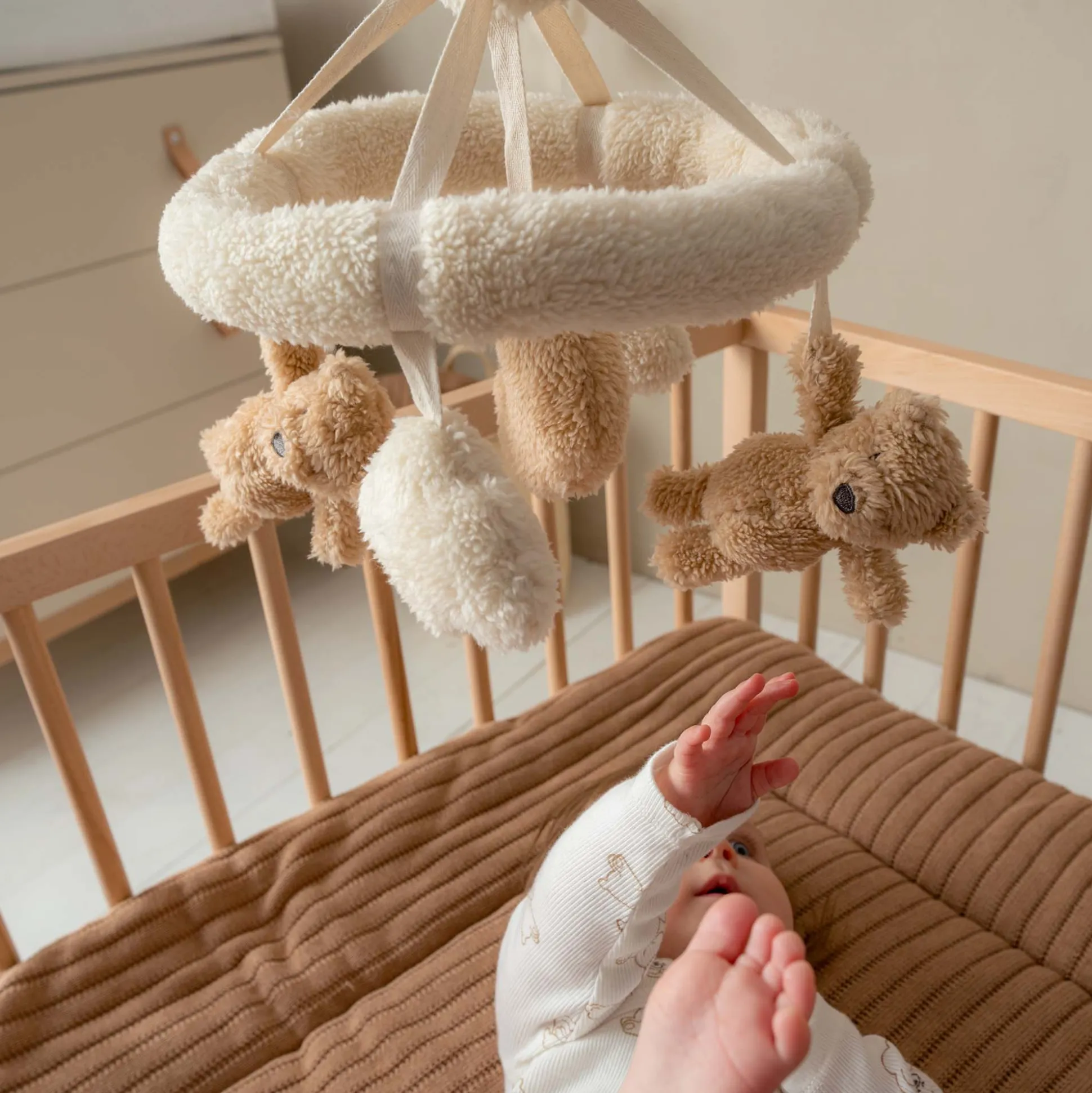 Je kindje zal zich met deze Prénatal beren muziekmobiel niet vervelen! Aan de muziekmobiel hangen twee beren, twee wolkjes en een maan. Allemaal gemaakt van een zachte teddystof. Behalve het luisteren, helpt de muziekmobiel met de ontwikkeling van de hand- en oogcoördinatie. De muziekmobiel is eenvoudig te bevestigen aan het bedje of aan de box. Ontdek ook de andere artikelen uit het Beren thema van Prénatal.