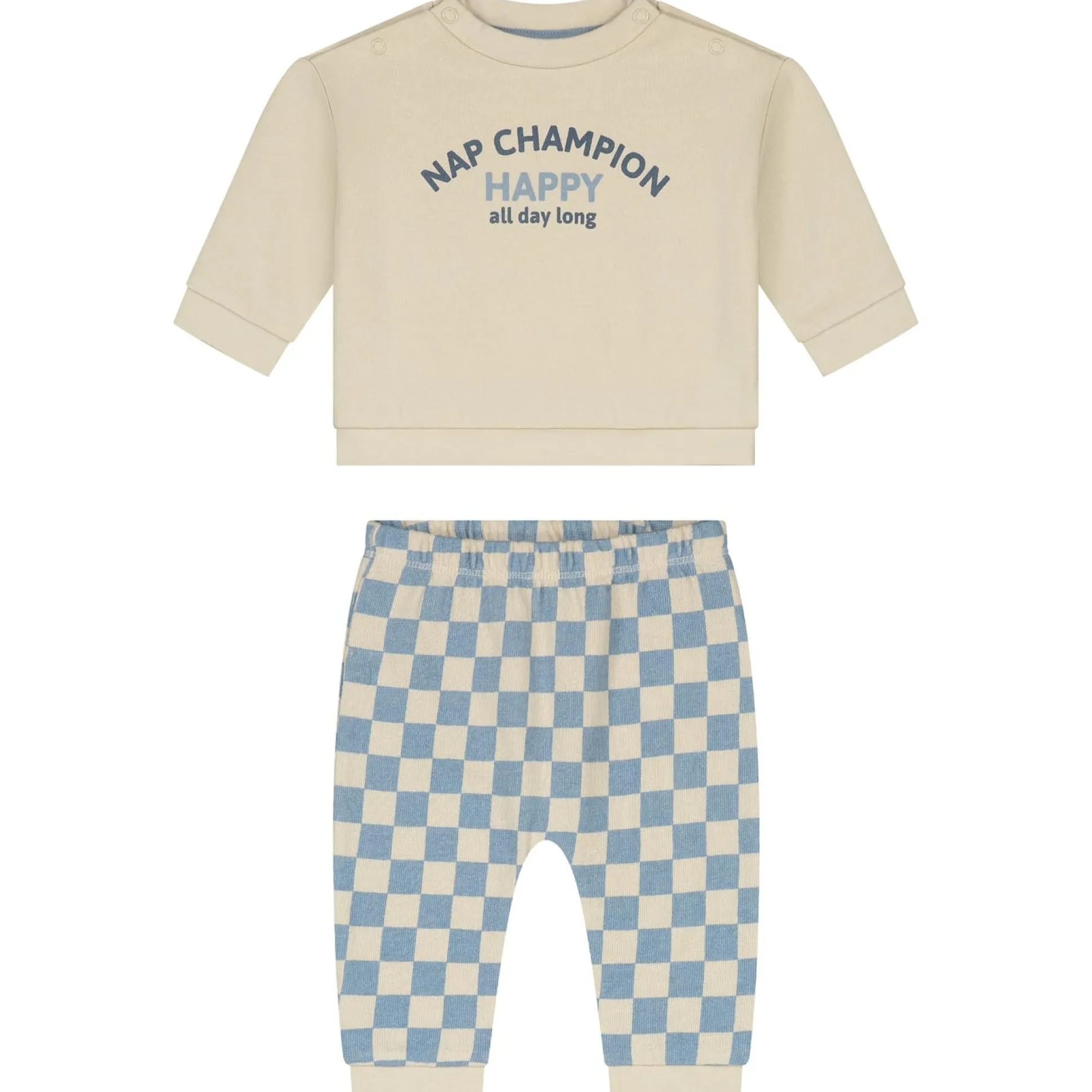 Deze prénatal kledingset bestaat uit een fijne sweater en een bijpassend broekje. Het setje heeft een broek met een iets wijdere fit en een bok patroon, de bijpassende sweater heeft een mooie ecru kleur en een print op de borst. Door de stretch en de knoopjes bij de hals is dit setje gemakkelijk aan- en uit te trekken. De set is verkrijgbaar in maat 50 t/m 68. Materiaal broek en top : 100% biologisch katoen. Wasvoorschrift: binnenstebuiten wassen op 40 graden met gelijke kleuren.
