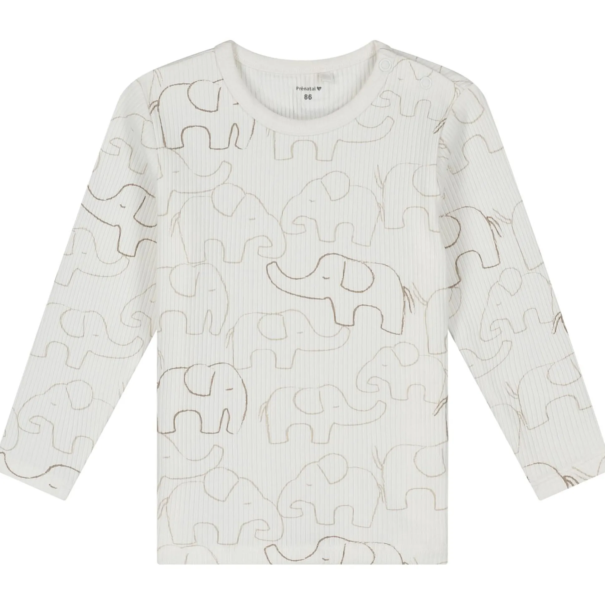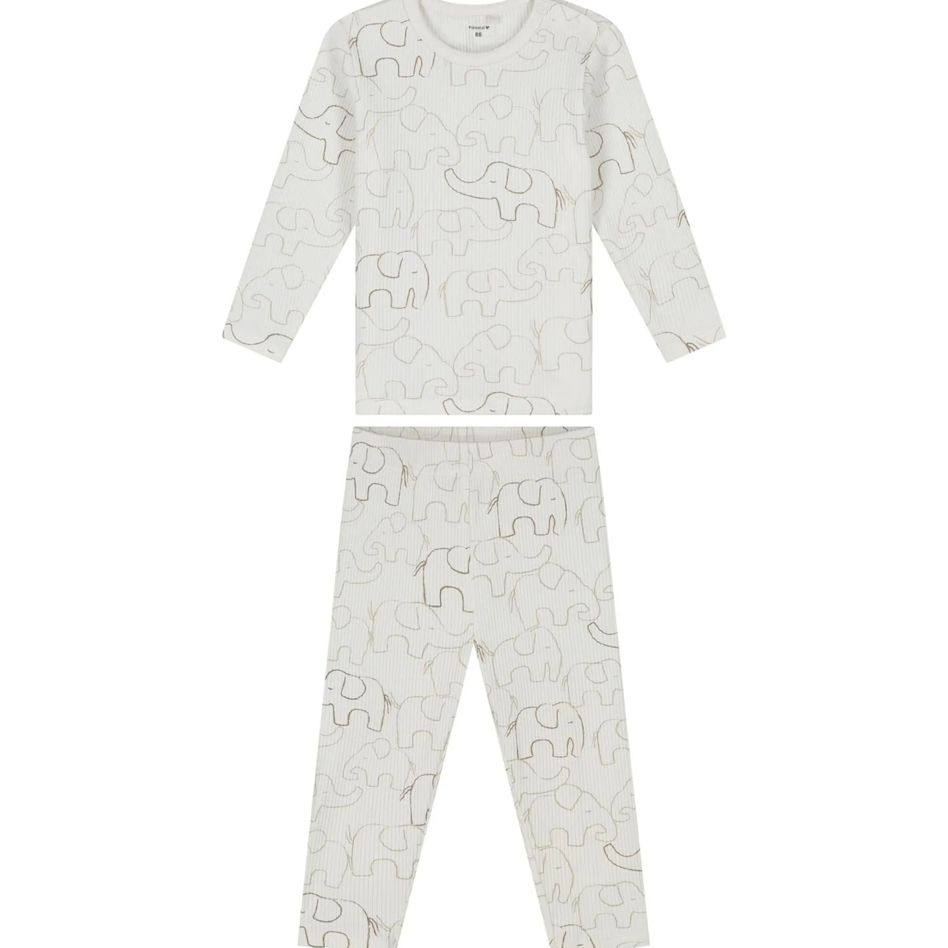Deze Prénatal peuter pyjama is gemaakt van zacht biologisch katoen met een ribstructuur. De pyjama heeft een ivoor witte ondergrond met een grijze all over olifantenprint en lange mouwen. De pyjama is gemakkelijk aan en uit te trekken door de envelophals voor babymaten en de drukknopen op de schouders voor peutermaten. De pyjama is goed te combineren met de rest van de Prénatal collectie en is verkrijgbaar in de maten 50 t/m 122. Kwaliteit: 96% biologisch katoen en 4% elastaan. Binnenstebuiten wassen op 40 graden met gelijke kleuren.