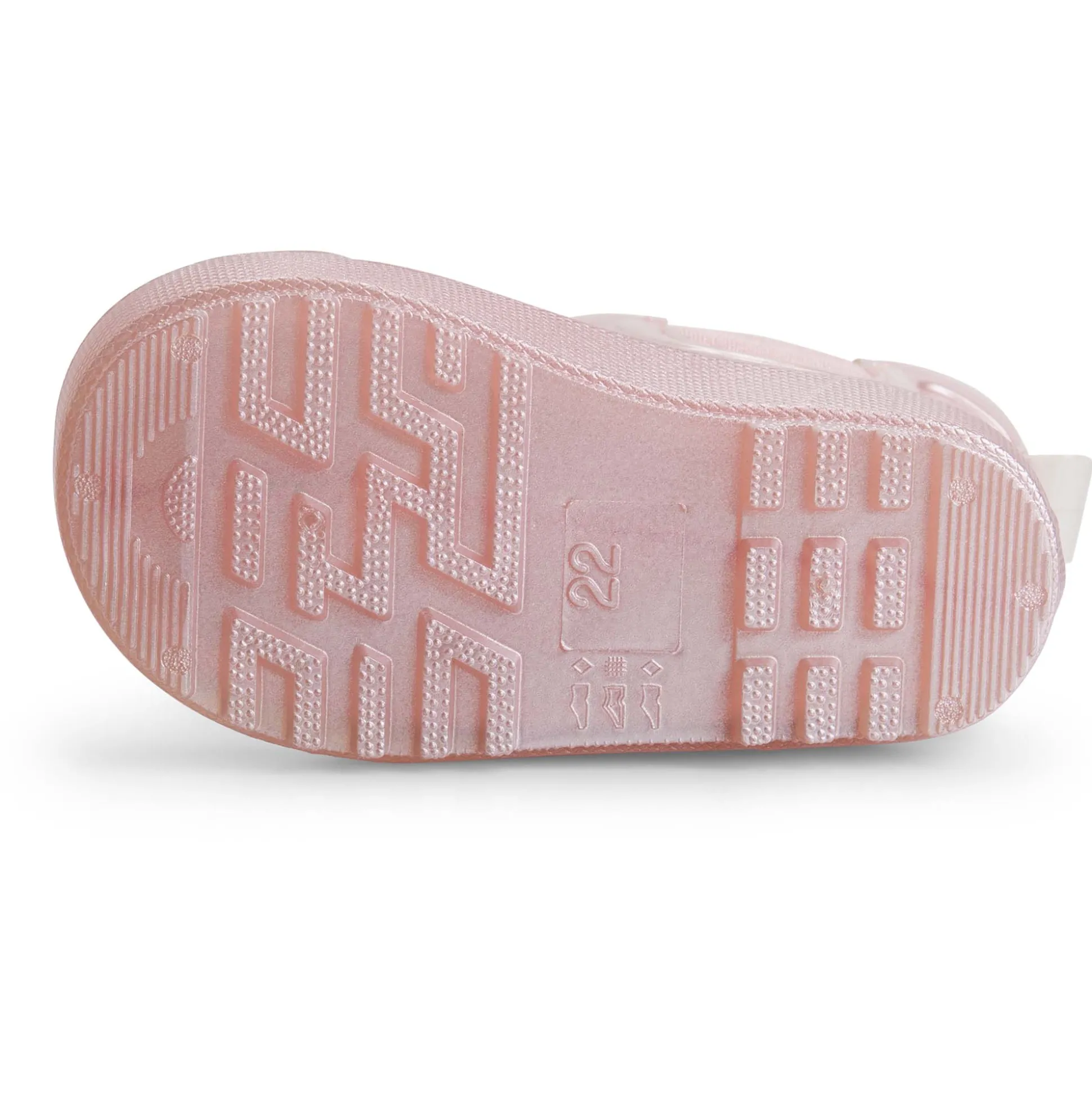 Prénatal peuter regenlaars. Deze mooie regenlaarzen zijn voorzien van een laag model tot op de enkels. Deze regenlaarzen hebben een metallic roze kleur met glitter elastiek aan beide kanten van de enkels, voor het makkelijk aan- en uittrekken. De zool heeft een stevig profiel waardoor je kindje veel grip heeft. Deze regenlaarzen zijn verkrijgbaar in maten 21 t/m 28. Kwaliteit: 100% PVC.
