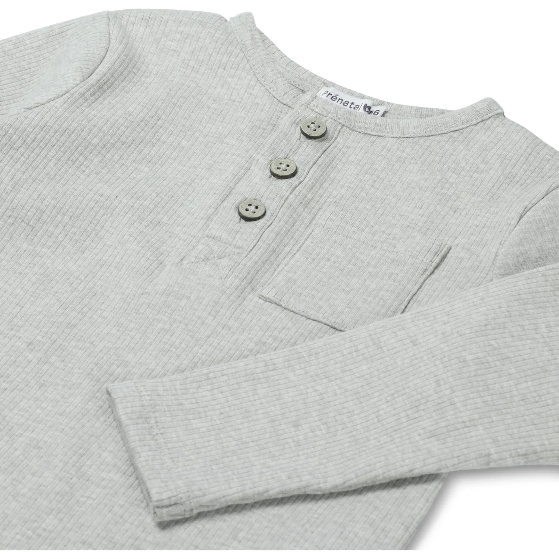 Dit Prénatal shirt is gemaakt van een fijne katoenen rib kwaliteit. Het shirt heeft lange mouwen en een ronde hals. Het shirt heeft een leuke knoopsluiting en een mooie melange kleur en is goed te combineren met de rest van de Prénatal collectie. Verkrijgbaar in de maten 56 t/m 122. Kwaliteit: 95% biologisch katoen en 5% elastaan. Binnenstebuiten wassen op 40 graden met gelijke kleuren. Dit product is getest op schadelijke chemicaliën en gecertificeerd volgens standaard 100 door OEKO-TEX® BJ020 169567 TESTEX.