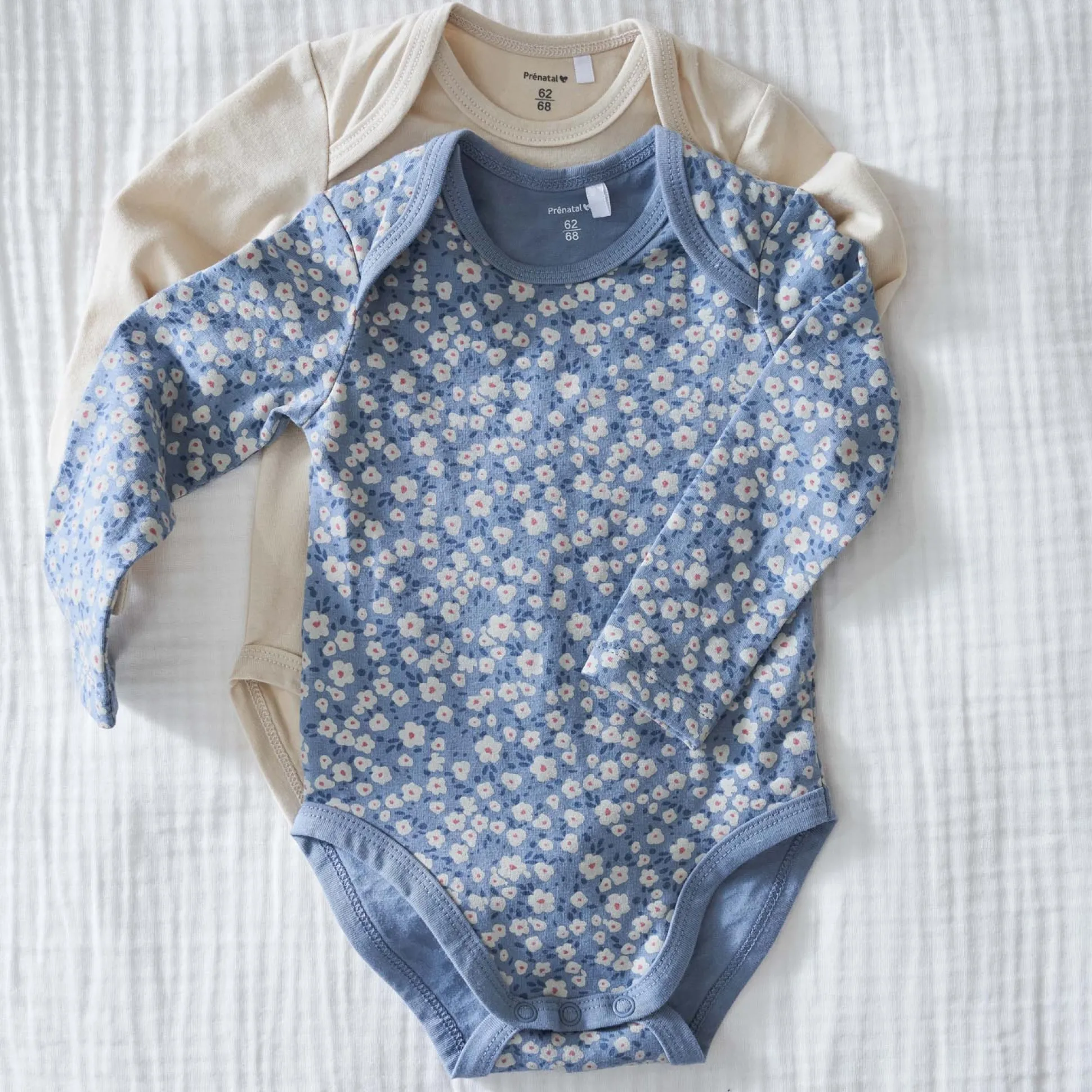 Deze Prénatal 2-pack rompers zijn gemaakt van zacht biologisch katoen en hebben lange mouwen. De set bestaat uit een romper in uni ecru en een romper met een blauwe ondergrond en allover bloemenprint. Door de envelophals en de drukknopen onderaan is het rompertje gemakkelijk aan en uit te trekken bij je kleintje. De romper is goed te combineren met de rest van de Prénatal collectie en is verkrijgbaar in de combinatiematen 50/56 t/m 86/92. Kwaliteit: 95% biologisch katoen en 5% elastaan. Binnenstebuiten wassen op maximaal 40 graden met gelijke kleuren.