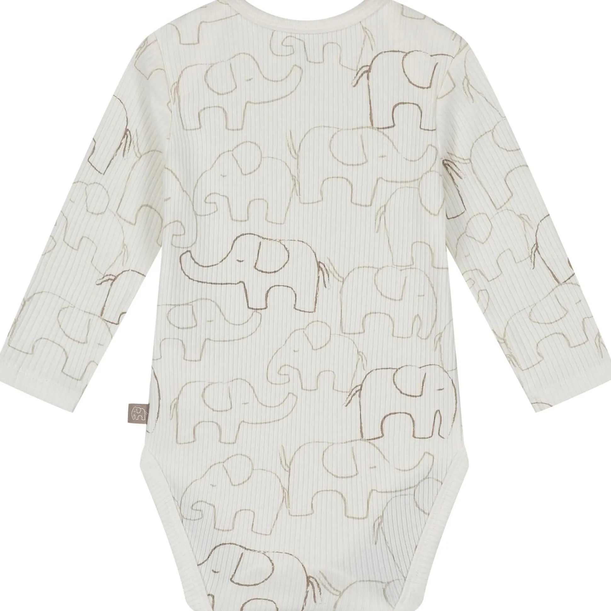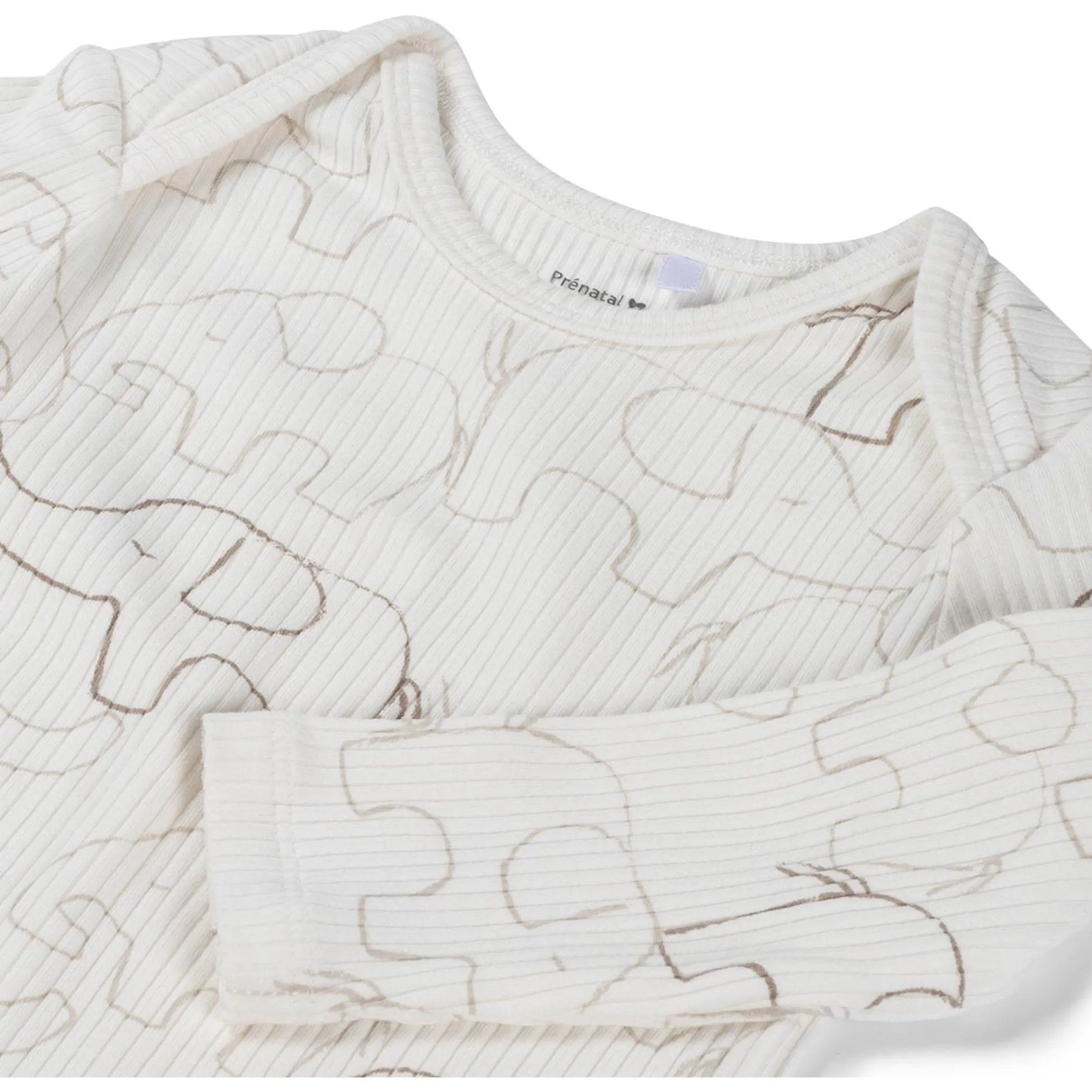 Deze Prénatal romper is gemaakt van zacht biologisch katoen met een ribstructuur. De romper heeft een ivoor witte ondergrond met een grijze all over olifantenprint en lange mouwen. Door de envelophals en de drukknopen onderaan is het rompertje gemakkelijk aan en uit te trekken bij je kleintje. De romper is goed te combineren met de rest van de Prénatal collectie en is verkrijgbaar in de combinatiematen 50/56 t/m 86/92. Kwaliteit: 96% biologisch katoen en 4% elastaan. Binnenstebuiten wassen op maximaal 40 graden met gelijke kleuren.
