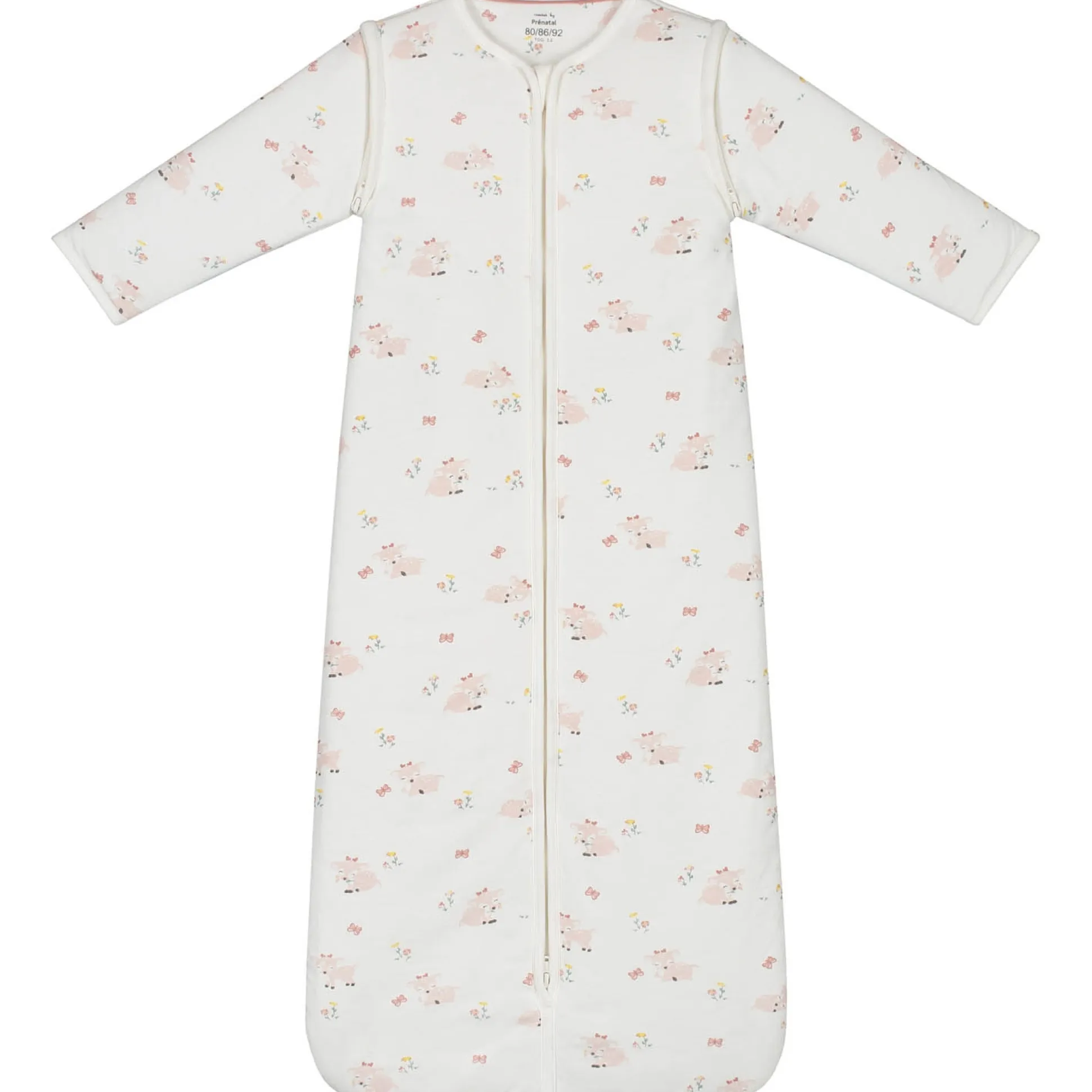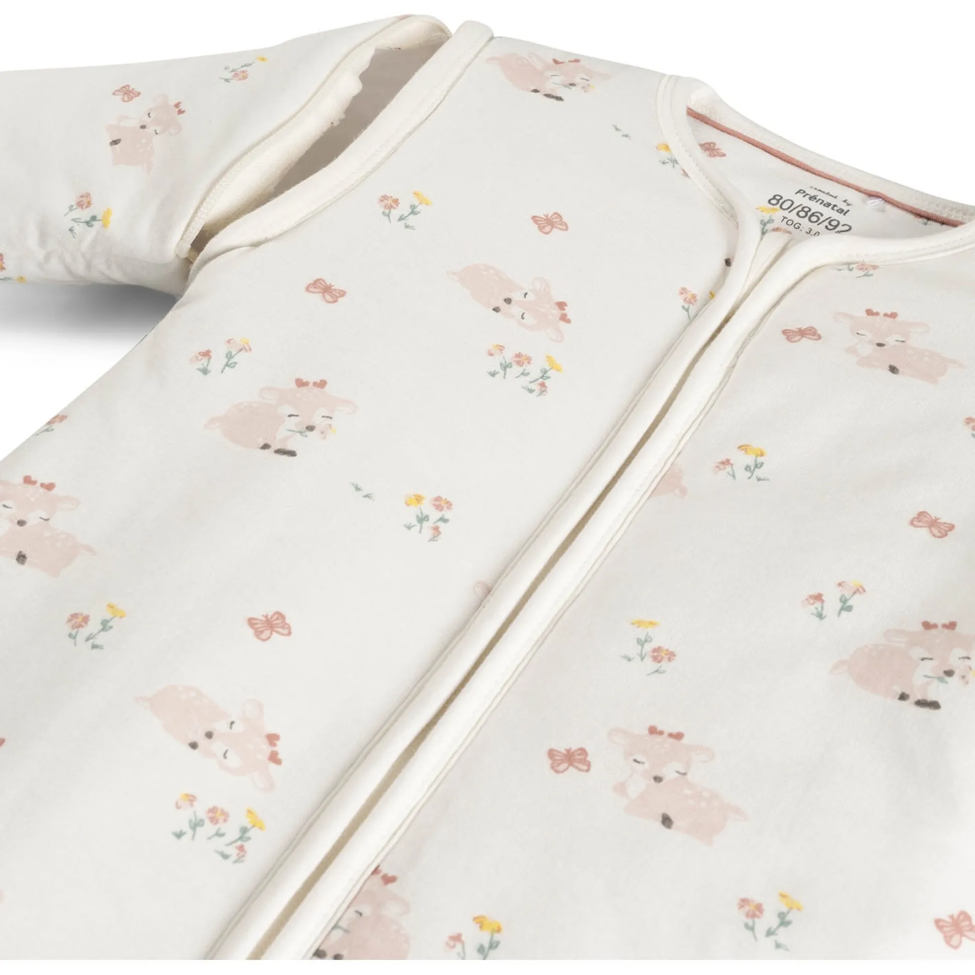 Deze Prénatal slaapzak is gemaakt van een zachte katoenen kwaliteit. De slaapzak is gevoerd en daardoor heerlijk voor de koudere momenten. De slaapzak heeft een mooie hertjes print. Deze fijne slaapzak heeft afritsmouwen waardoor hij gedragen kan worden als met en zonder mouwen. De slaapzak is goed te combineren met de rest van de Prénatal collectie en is verkrijgbaar in de maten 56/62 t/m 98/104/110. Binnenstebuiten wassen op 40 graden met gelijke kleuren. Kwaliteit: buitenstof 100% biologisch katoen, lining 100% biologisch katoen en voering 100% polyester. Wij adviseren om de slaapzak niet te drogen in de droger. De TOG-waarde van de slaapzak is 3,0.