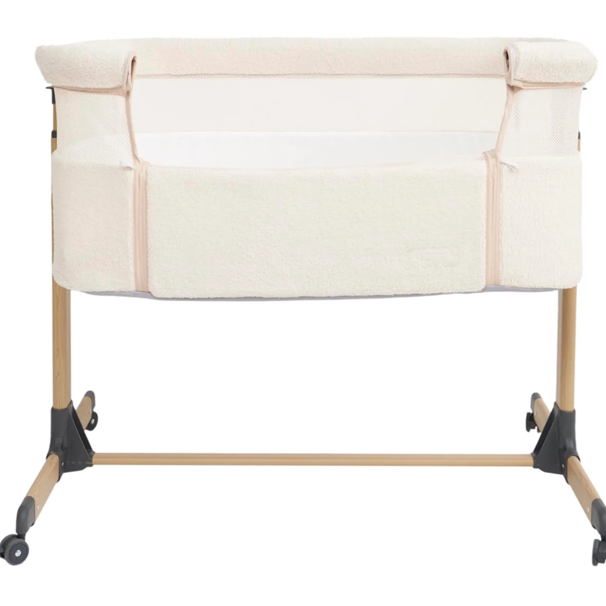 De Prénatal co-sleeper is ideaal om ervoor te zorgen dat je kindje tijdens het slapen dicht bij je is. De Prénatal co-sleeper in teddy uitvoering heeft een mooie luxe uitstraling en is beschikbaar in twee stijlvolle kleuren: Ivoor white en Sandbrown. De co-sleeper heeft 6 verschillende standen zodat deze op de juiste hoogte gezet kan worden en te combineren is met verschillende matrashoogtes. Door de mesh zijkanten is er genoeg luchtdoorlatendheid waardoor je kindje heerlijk kan slapen. De co-sleeper is licht van structuur en eenvoudig te monteren. Doormiddel van een bevestigingssysteem kun je het bedje eenvoudig aan het bed van de ouders bevestigen. Geschikt vanaf de geboorte tot je kleintje 9kg is. Afmetingen: 53x90x77 Cm (LxBxH).
