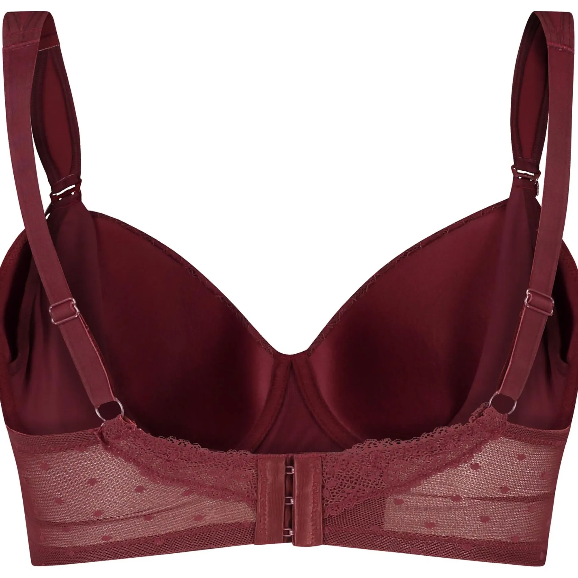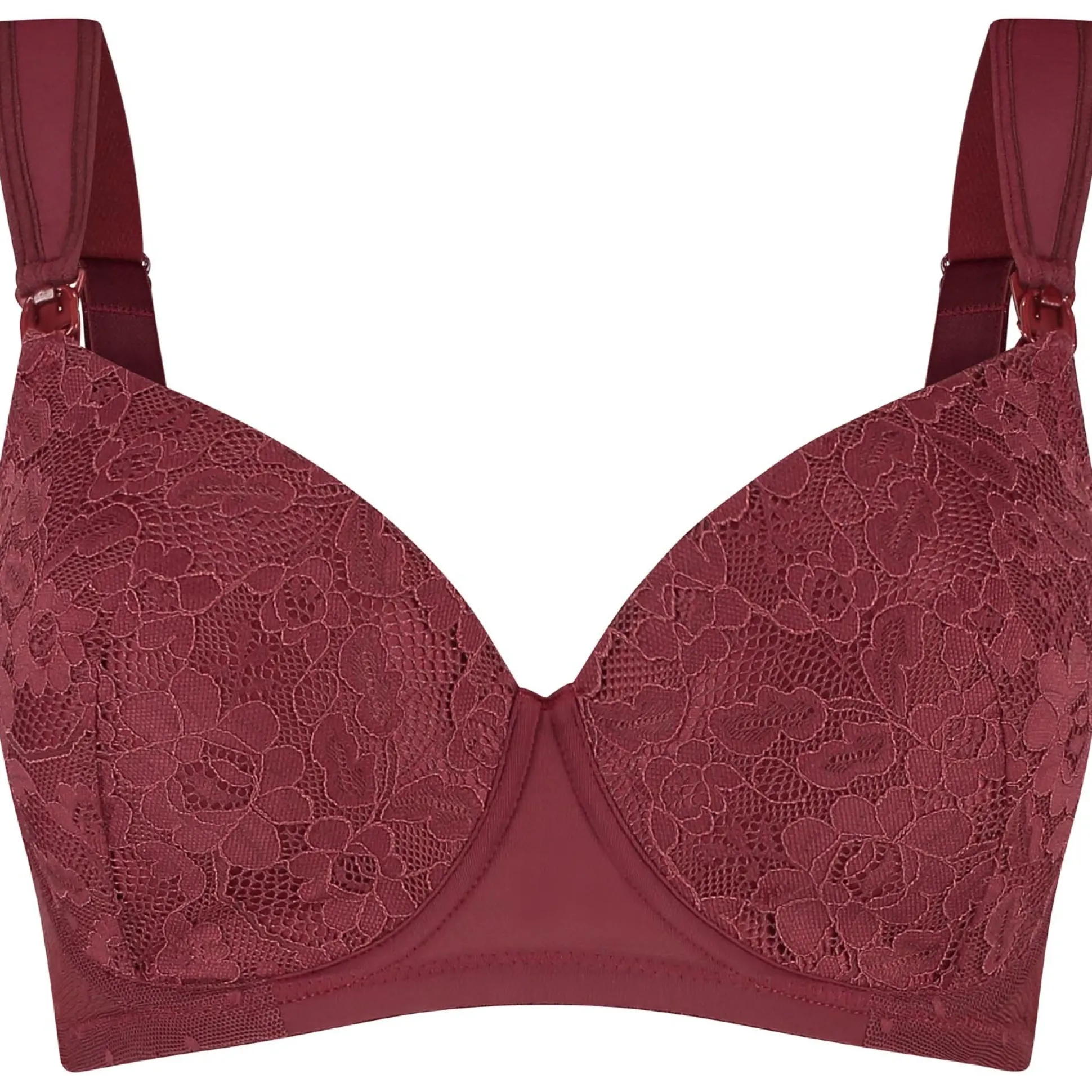 Prénatal voedingsbh. Deze voedingsbh van Prénatal is voorzien van een beugel en heeft voorgevormde cups. De voedingsbh is verkrijgbaar in een bordeauxrode tint en is mooi afgewerkt met kant bij de cups en daarnaast is er een bijpassende slip verkrijgbaar. De voedingsbh heeft voedingsclips aan de voorzijde, wat ideaal is bij het geven van borstvoeding. Daarnaast kun je de bh ook al dragen tijdens de zwangerschap vanwege het draagcomfort. De schouderbanden zijn verstelbaar aan de achterzijde. De rugsluiting is viervoudig verstelbaar. Het model is verkrijgbaar van maat 75C t/m 95G. Samenstelling: 85% polyamide en 15% elastaan. Wasvoorschrift: handwas. Tip: om er zeker van te zijn dat je de juiste maat bestelt, bekijk hier onze maattabel.
