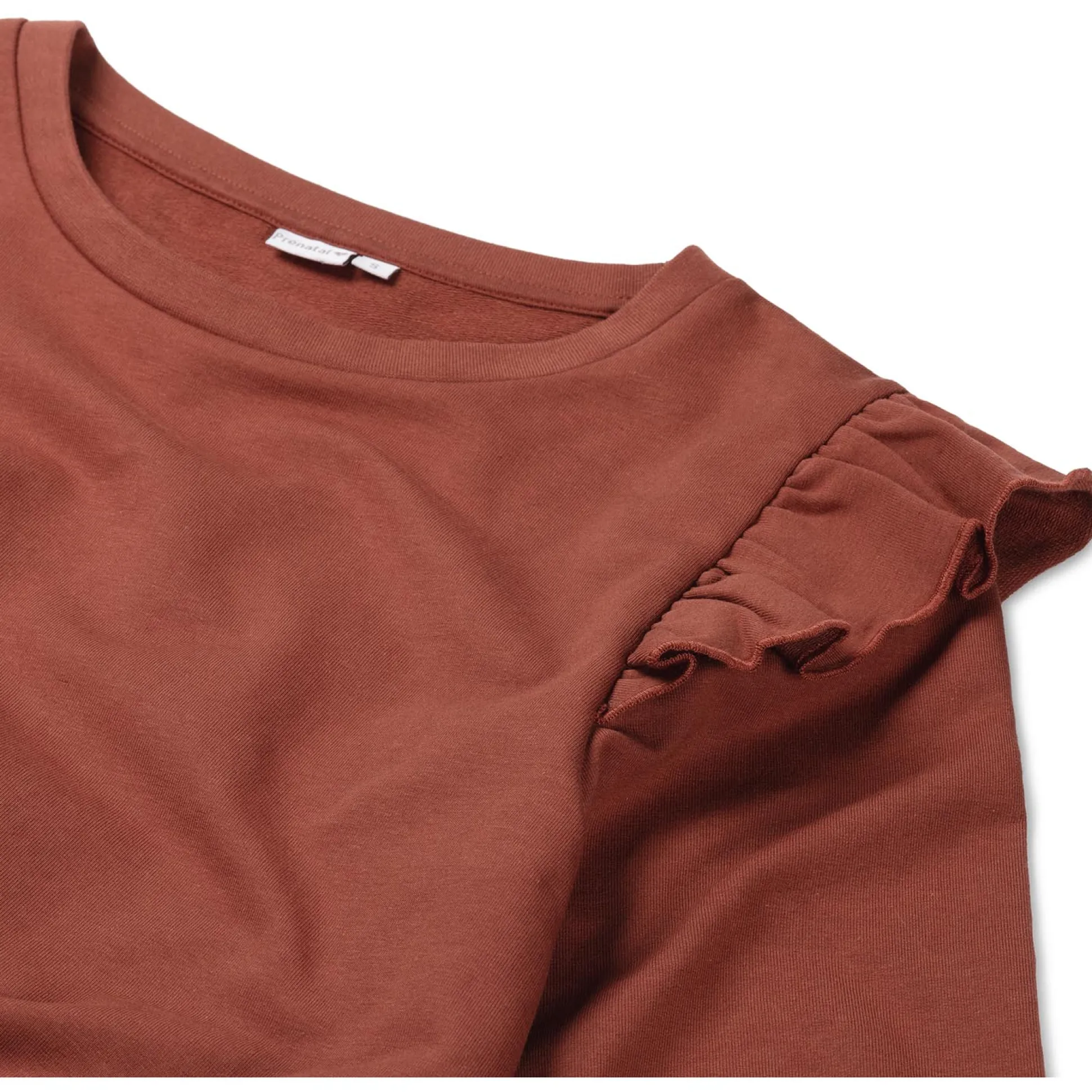 Prénatal zwangerschapssweater. Deze sweater is gemaakt van een fijne biologisch katoenen sweatstof. De sweater heeft een ronde hals en is kort, hierdoor komt je zwangere buik extra mooi uit. Daarnaast heeft de trui lange ballonmouwen en een leuke ruffle rond het armsgat. Combineer de zwangerschapssweater met één van de andere stijlen van Prénatal. Verkrijgbaar in de maten XS t/m XXL. Samenstelling: 75% biologisch katoen, 20% polyester en 5% elastaan. Wassen op 40 graden met gelijke kleuren. Dit product is getest op schadelijke chemicaliën en gecertificeerd volgens standaard 100 door OEKO-TEX® 2017OK0029 AITEX.