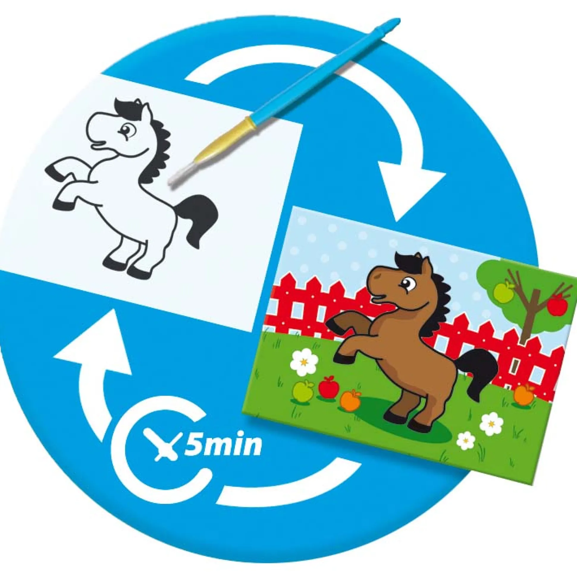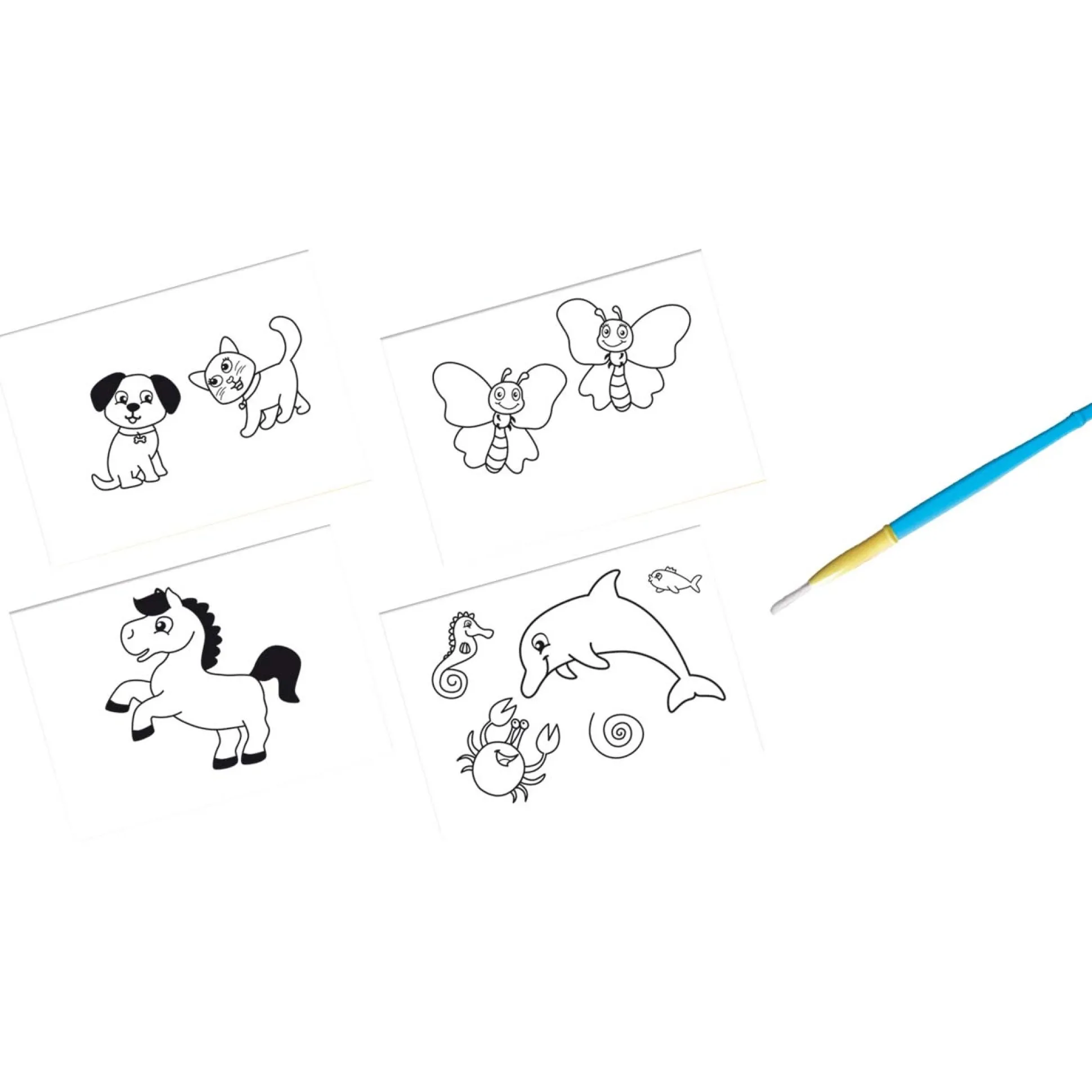 Magie met water en verven zonder geknoei! Dat kan met deze unieke set van SES. Ga met een natte kwast over de voorbedrukte kaarten en zie hoe de kleurplaat zichtbaar wordt. De kwast is veilig te gebruiken, omdat de haren niet kunnen uitvallen. Na opdrogen steeds opnieuw te gebruiken. De set bevat een veilige kwast en 4 voorbedrukte kaarten. Geschikt voor kinderen vanaf 12 maanden.