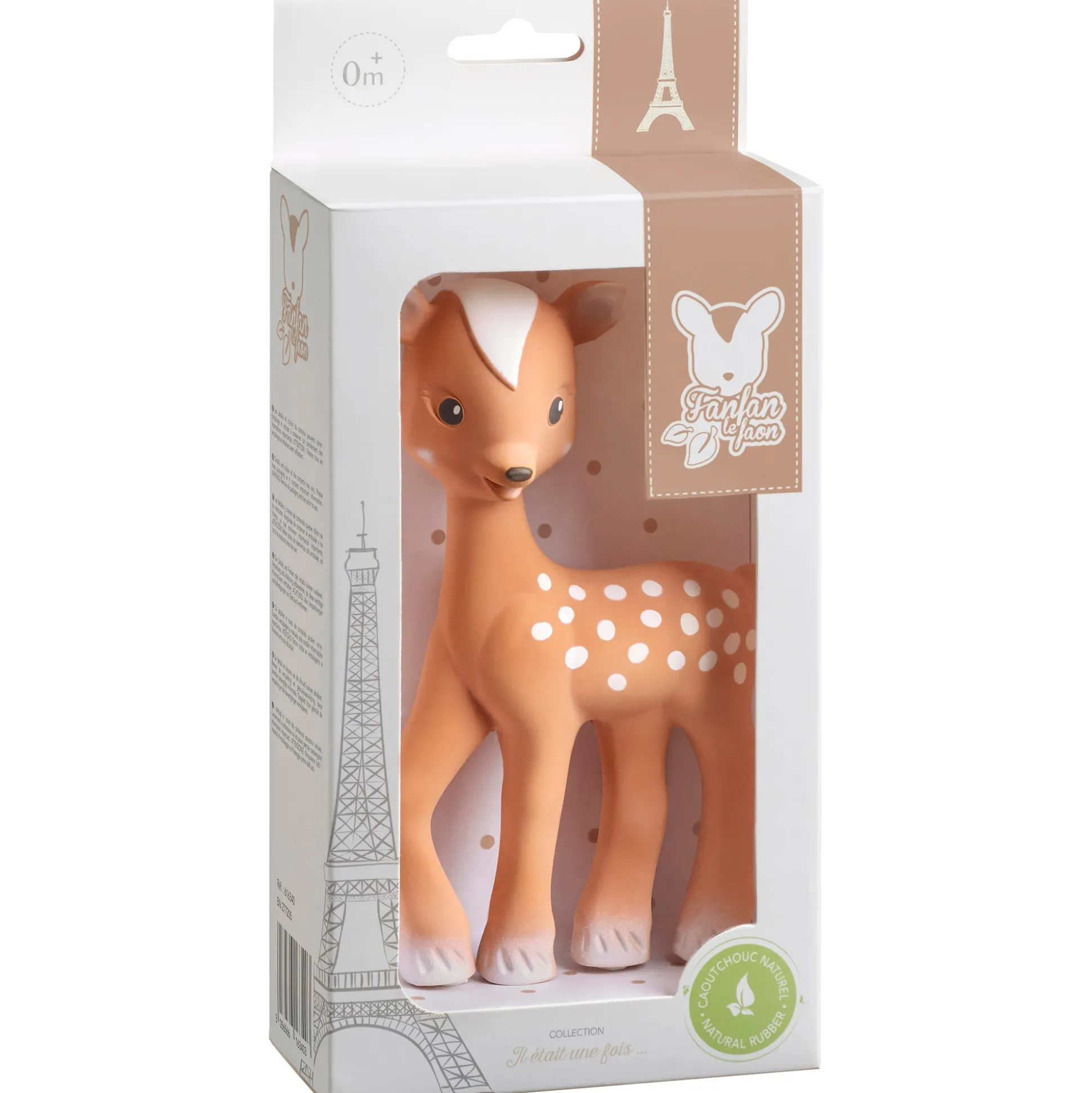 Het bijtspeeltje van Sophie de giraf is een veilig en duurzaam speeltje. Het hertje Fanfan is gemaakt van 100% natuurlijk rubber afkomstig van de Hevea boom en bewerkt met verf die gebruikt wordt in de voedingsmiddelenindustrie. Hierdoor is FanFan absoluut vrij van schadelijke stoffen zoals PVC, Phthalaten, BPA en andere weekmakers. FanFan kan door kindjes met hun kleine handjes makkelijk worden vastgepakt. Haar donkere kleur en lichte vlekjes wekken door het contrast de aandacht van de baby en zorgen ervoor dat de baby haar herkent. Doordat FanFan is gemaakt van natuurrubber heeft ze een bijzondere geur waardoor de baby haar ook makkelijk herkent tussen alle speeltjes. Het subtiele piepje stimuleert het gehoor en zorgt ervoor dat de baby kennis maakt met oorzaak-gevolg. En wanneer baby tandjes krijgt, bieden de oortjes en lange poten verlichting door erop te sabbelen en te bijten. Vanaf 0+ maanden.