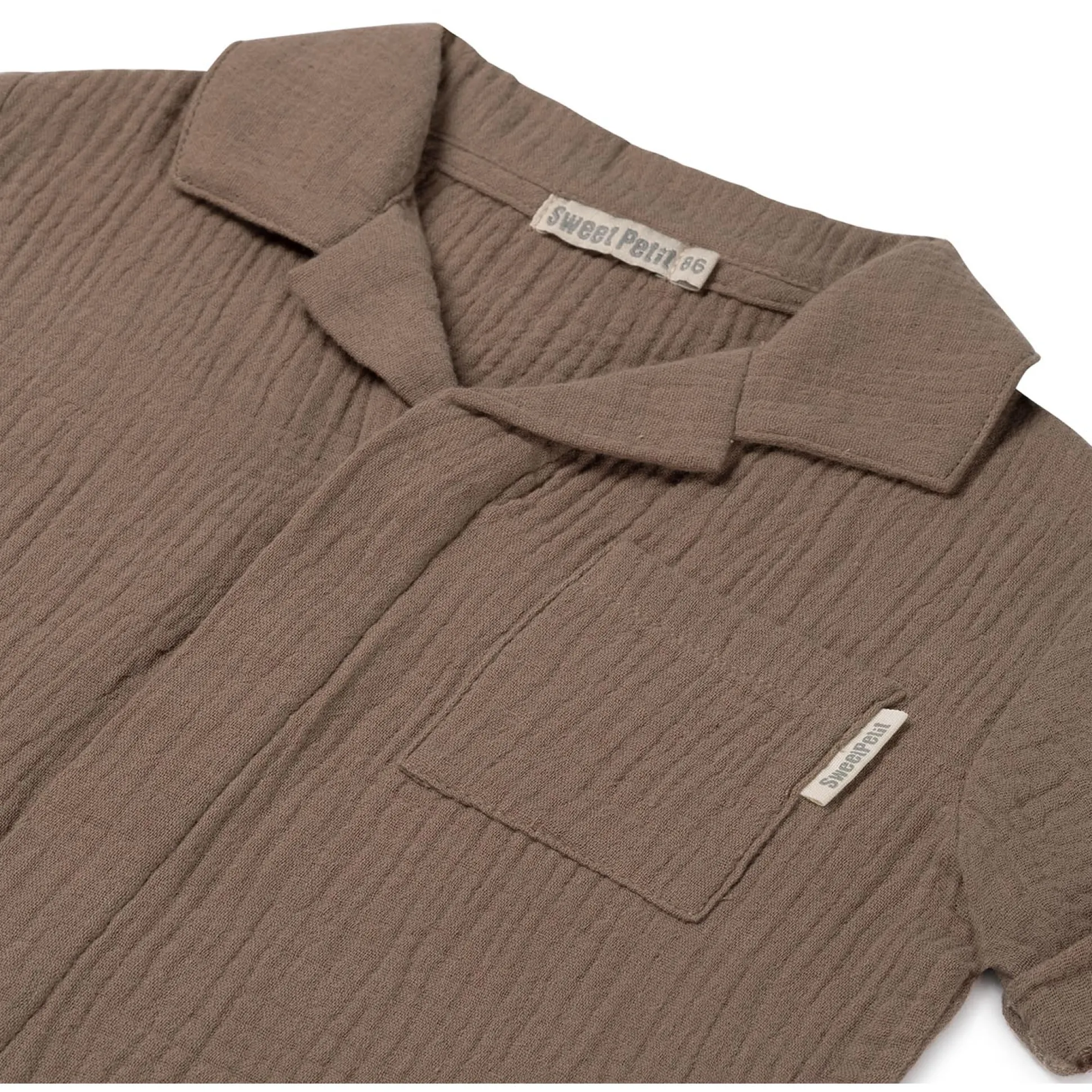 Deze Sweet Petit blouse is gemaakt van een fijne katoenen mousseline kwaliteit. De blouse heeft korte mouwen en een knoopsluiting aan de voorzijde. De blouse is voorzien van een mooie bruine kleur. De blouse is goed te combineren met de rest van de Sweet Petit collectie bij Prénatal. Verkrijgbaar in de maten 56 t/m 122. Kwaliteit: 100% biologisch katoen. Binnenstebuiten wassen op 30 graden met gelijke kleuren. Dit product is getest op schadelijke chemicaliën en gecertificeerd volgens standaard 100 door OEKO-TEX® BJ020 169567 TESTEX.