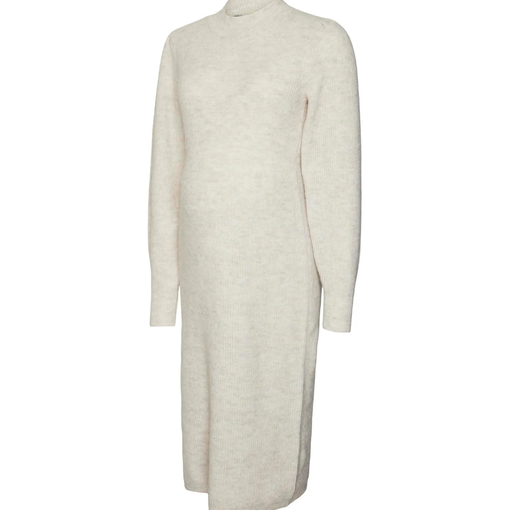 VERO MODA zwangerschapsjurk. Deze gebreide jurk is deels gemaakt van gerecycled polyester. De jurk heeft een ronde opstaande hals en lange mouwen met manchetten. De jurk valt over de knie en heeft aan de onderzijde rechts een split. Combineer de jurk met een panty of legging van Prénatal. Verkrijgbaar in de maten S t/m XXL. Samenstelling: 52% gerecycled polyester, 18% acryl, 17% wol, 10% polyamide en 3% elastaan. Binnenstebuiten wassen op 30 graden met gelijke kleuren.