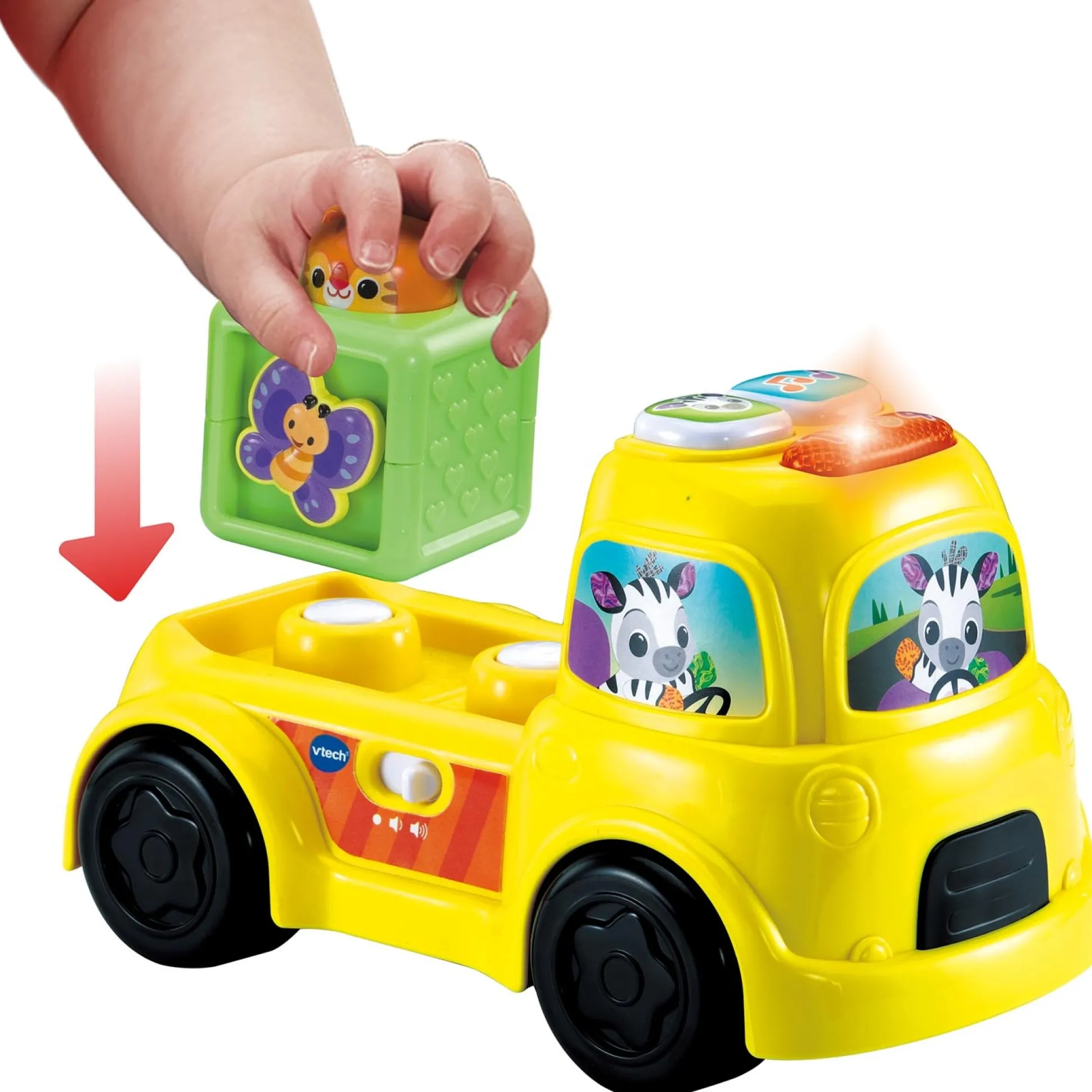 Stapel de kleurrijke blokken in de truck om vrolijke reacties te horen. Of druk op de dieren en zie de bewegende onderdelen roteren. Maak kennis met cijfers en tellen en druk op de toetsen van de truck om vrolijke zinnetjes, grappige geluiden, melodietjes en gezongen liedjes te horen.